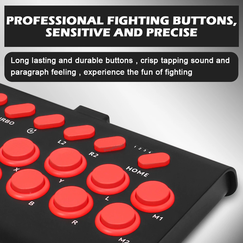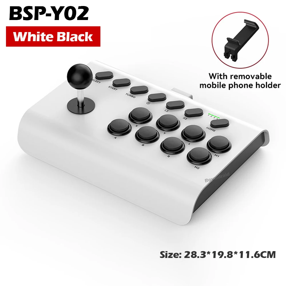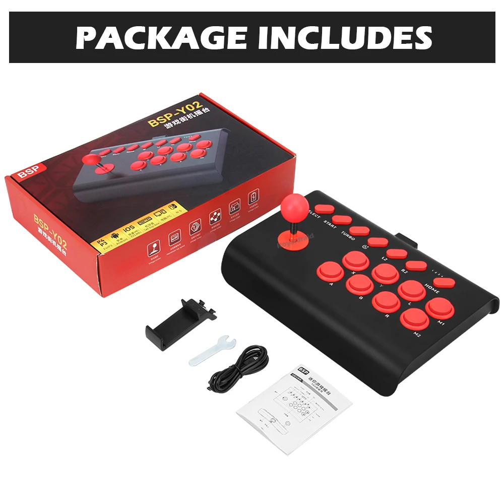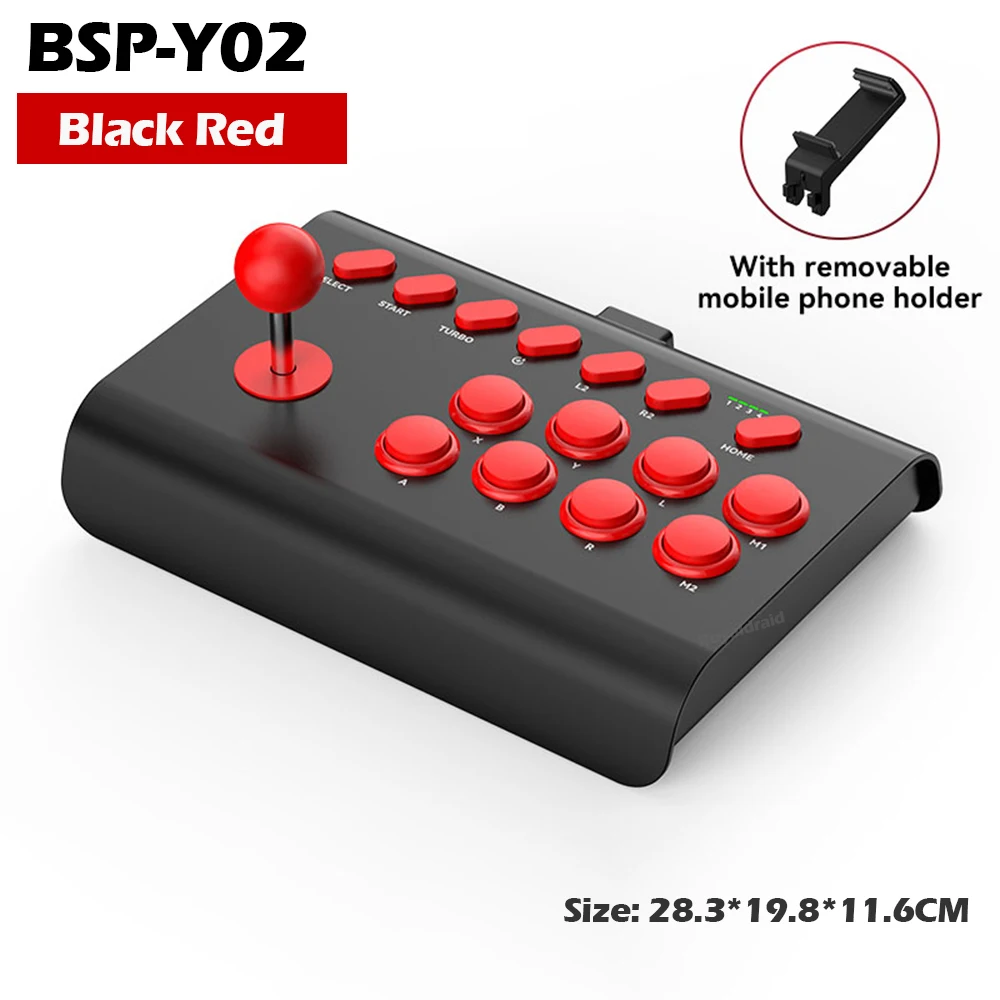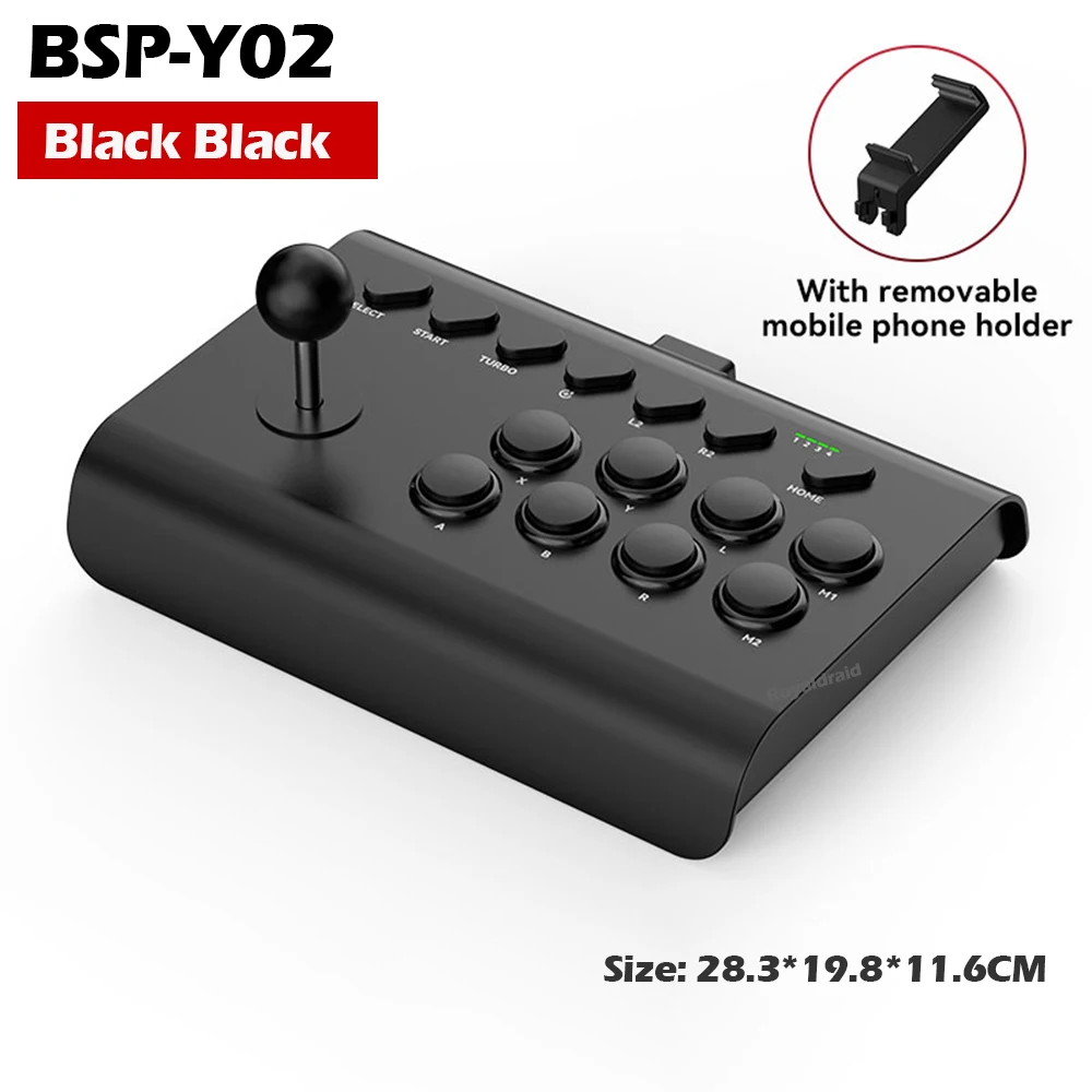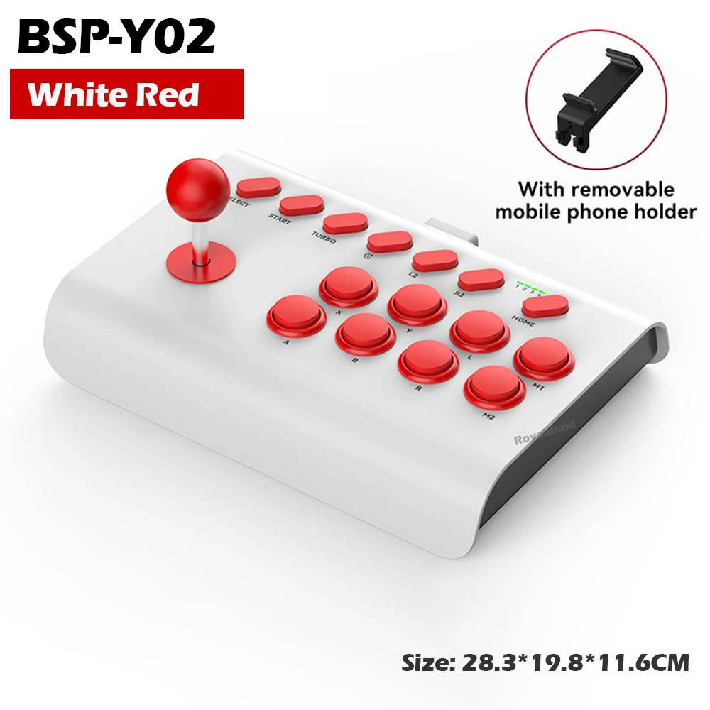 Joystick de juego de lucha Y02 con soporte estirable Consola de juegos Función Macro/TURBO de conexión de 3 modos para PS4/Xbox One/Switch OLEDNuevo control de juegos Arcade inalámbricos Y02 de 8 teclas para PS4/PS3/Switch/Switch controlador de consola OLED PC/TV/Android/MFI teléfonos Joystick Gamepad accesoDescripción:1.Joystick Arcade Retro Y02, nostálgico para los clásicos.2.Admite múltiples plataformas, adecuadas para PS4/Switch&OLED/Android/teléfonos Apple/computadora/TV/cajas de juegos.3.Admite disparo continuo automático de una tecla TURBO, ataque continuo.4.Batería incorporada de gran capacidad de 600 mAh, resistencia duradera.5.Admite tres modos de conexión con cable, inalámbrico compatible con BT y inalámbrico de 2,4G.6.Joystick de juego de rango completo, guía clara, posicionamiento preciso.7.Botones de lucha profesionales, sensibles y precisos.8.Diseño arcade convencional, botones estandarizados, diseño ergonómico, funciones claras y concisas.9.Admite configuraciones macro, combinaciones de una tecla y ultrarrápido.10.Rendimiento de alta gama, chip de juego de lucha, permite un inicio rápido del juego, sin demoras, gráficos claros y una experiencia de juego mejorada.11.Compatible con una gran cantidad de juegos, no compatible con juegos con vista de perspectiva.12.Se puede conectar a decodificadores, computadoras y pantallas grandes para una experiencia de juego inmersiva.13.Equipado con un soporte extensible, admite teléfonos con un ancho de 48-91 mm.Especificaciones:Nombre: Joystick inalámbrico con soporteModelo: BSP-Y02 8 teclasColor: 4 coloresMaterial: ABSTipo de interfaz: TIPO-CMétodo de conexión: compatible con BTTamaño del producto: 283 mm * 198 mm * 116 mmMétodo de vibración: sin vibraciónBatería: batería incorporada de 600 mAhTiempo de carga: alrededor de 2 horasDuración de la batería: aproximadamente 15 horasPlataformas compatibles: para PC/MFI/Androd/PS3/PS4/Switch, decodificadoresCaracterísticas: Compatibilidad multiplataforma, para disparo continuo con una sola tecla TURBO, configuraciones macro, compatible con una gran cantidad de juegos, con soporte para teléfono, batería incorporada de gran capacidad.Contenido del paquete:1 joystick inalámbrico1x soporte para teléfono1x Cable de carga1x Manual de usuario1 paquete al por menorNota:1.Debido a la diferencia de luz y pantalla, el color del artículo puede ser ligeramente diferente al de las imágenes.2.Permita una ligera desviación en los datos de medición y asegúrese de que no le importe antes de realizar el pedido.3. Si no se aceptan disputas como regalo, ya que son gratuitas, no se reciben el pago, esperamos comprensión, gracias.