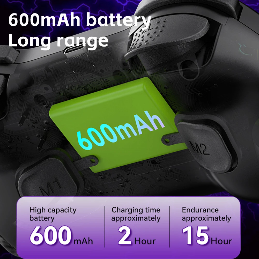 4. Configuración de doble pasillo, larga duración de la batería:Equipado con joysticks Hall 3D de grado deportivo, el controlador de juego reduce significativamente la amortiguación del joystick para un control suave y preciso sin deriva. Los disparadores Hall de grado Esports proporcionan un intervalo de respuesta 0,1mm. Al controlar las señales analógicas a través de la inducción electromagnética, estos disparadores ofrecen un rendimiento, una experiencia y una respuesta táctil excepcionales. La batería recargable incorporada de 600mAh se encuentra dentro del controlador, lo que elimina la necesidad de reemplazar la batería. Tarda aproximadamente 2 horas en cargarse completamente y puede proporcionar un uso continuo durante 10-15 horas. Si la batería se agota, simplemente conecte el cable de datos USB para continuar jugando.