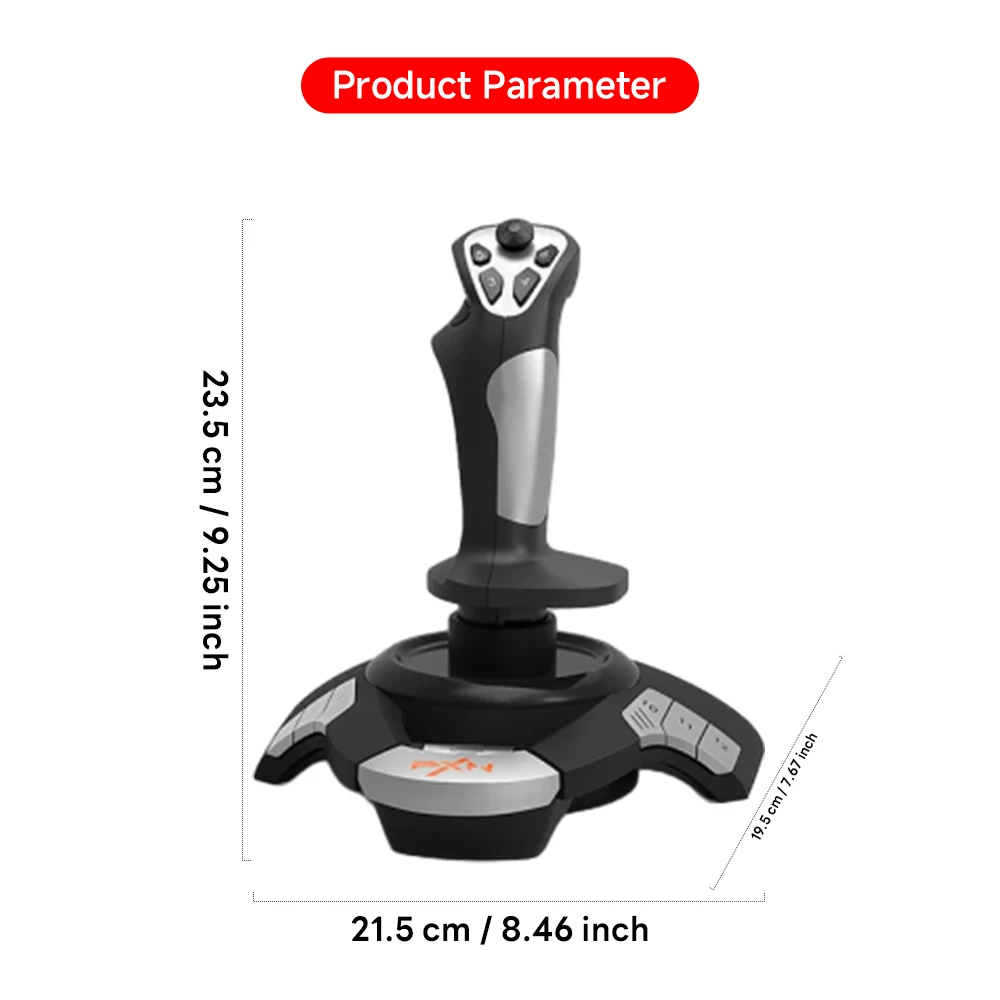 PXN-F16 USB con cable Flight Stick Joystick motor incorporadoEspecificaciones:Modelo del producto: PXN-F16Conexión: cable USBFuente de alimentación de trabajo: DC 5VCorriente de trabajo: menos que 20MA bajo condición normal, menos que 100MA bajo condición de la vibraciónTamaño del paquete: aproximadamente 215 × 195x250mmDimensiones del producto: 198 X190X 220mmPeso corporal: alrededor de 517 gramosTemperatura de funcionamiento: 10-40 °CHumedad de funcionamiento: 20 ~ 80%Longitud del cable USB: 1,8 mPlataforma apoyada: PCPlataforma apoyada PC: Windows XP/7/8/10Características:1,4 ejes, un interruptor de sombrero de ocho vías y 12 botones de acción.La base del ángulo 2. Triple previene el inclinado y la elevación3,12 botones de acción, un interruptor de sombrero de ocho vías y un disparador de disparo rápido4. motor incorporado que proporciona experiencia de juego inmersiva5. soporte para programar botones por conductor6. característica de amortiguación del acelerador7. Longitud del cable USB 2 metros8. Funciona en PC (WindowsXP/7/8/10/11) Descripción del productoAviso:Evite la fuerza excesiva: Use movimientos suaves y controlados cuando opere el joystick. Evite aplicar fuerza excesiva o movimientos bruscos, ya que esto puede provocar un desgaste prematuro. 2.center el joystick: después de Usar el joystick, devuélvalo siempre a su posición neutral o central. Esto ayuda a evitar una tensión innecesaria en el mecanismo del joystick y garantiza una entrada precisa durante el juego. Limpie regularmente: el polvo, la suciedad y los desechos pueden acumularse alrededor del joystick, lo que afecta su capacidad de respuesta. Limpie periódicamente el joystick y su área circundante para mantener un rendimiento óptimo.