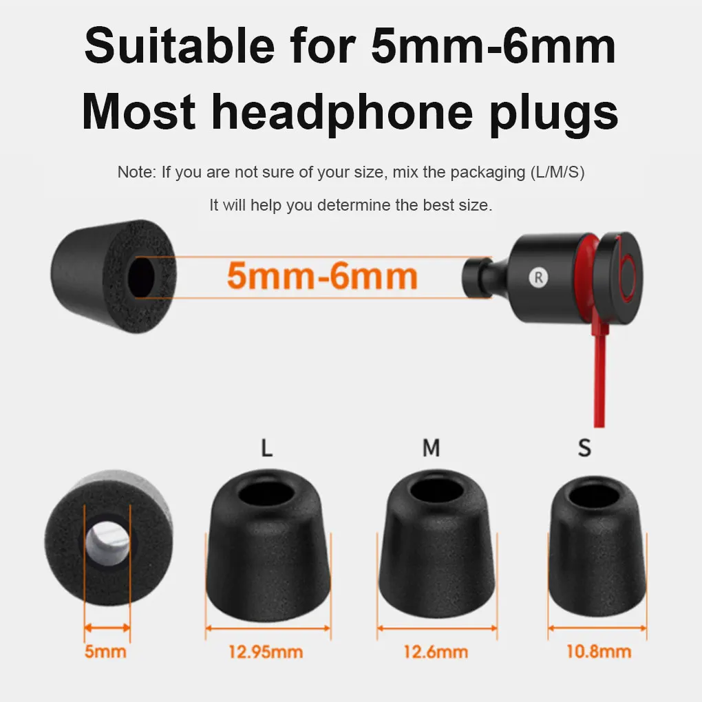 Adecuado para canales auditivos de varios tamaños, transpirable, suave y cómodo.Frote la esponja de memoria al mínimo antes de entrar en el oído (alrededor de 5 segundos de tiempo de rebote, cuanto más tiempo de rebote, mejor será la calidad de la esponja de memoria) la esponja se expandirá y llenará lentamente según los diferentes canales auditivos.Las orejeras de material de espuma viscoelástica, que tienen un cierto efecto de aislamiento acústico que las orejeras de silicona normales, están cerca de las orejas, de modo que la música rebota completamente en tus oídos, mejorando el efecto de graves.Caja de almacenamiento de diseño exclusivo, que se puede almacenar en la caja después de su uso, lo que puede extender la vida útil de la tapa del oído.Adecuado para la mayoría de los enchufes de auriculares de 5mm-6mm.Especificación:Nombre: tapones de memoria.Material: espuma viscoelástica.Espuma viscoelásticaGrande: 12,95mm de diámetro exterior y 5mm de diámetro interiorMedio: 12,6mm de diámetro exterior y 5mm de diámetro interiorPequeño: 10,8mm de diámetro exterior y 5mm de diámetro interiorTapas de siliconaGrande: 12,95mm de diámetro exterior y 4,56mm de diámetro interiorMedio: diámetro exterior 12,6mm diámetro interior 4,56mmPequeño: 10,8mm de diámetro exterior, 4,56mm de diámetro interiorCompatible: auriculares de 5mm-6mm.Color: (esponja de memoria) negro, rojo, gris.Nota:Puede haber un poco de distorsión de color debido a las diferentes resoluciones del ordenador.Puede haber errores de tamaño debido a las diferentes resoluciones del ordenador.El paquete incluye:1 * Juego de puntas de esponja para los oídos (incluye 12 piezas).