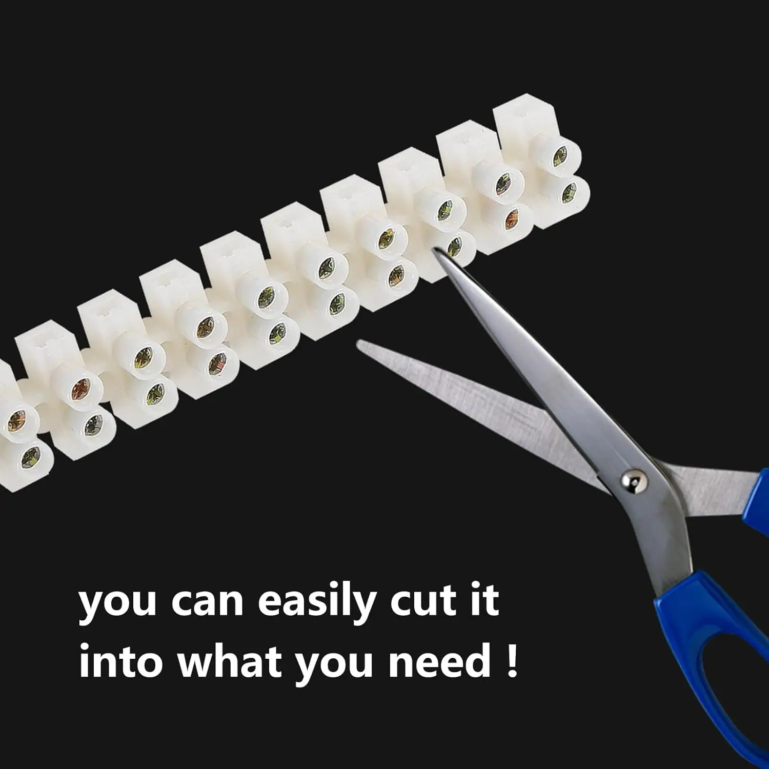 Fácil de instalar: simplemente tire los cables, insérselos en la regleta de terminales y apriete los tornillos, sin necesidad de soldadura problemática;Muy cómodo de usar, y puede usar tijeras u otras herramientas, cortar el bloque de terminales de tornillo y convertirse en piezas pequeñas según lo exige