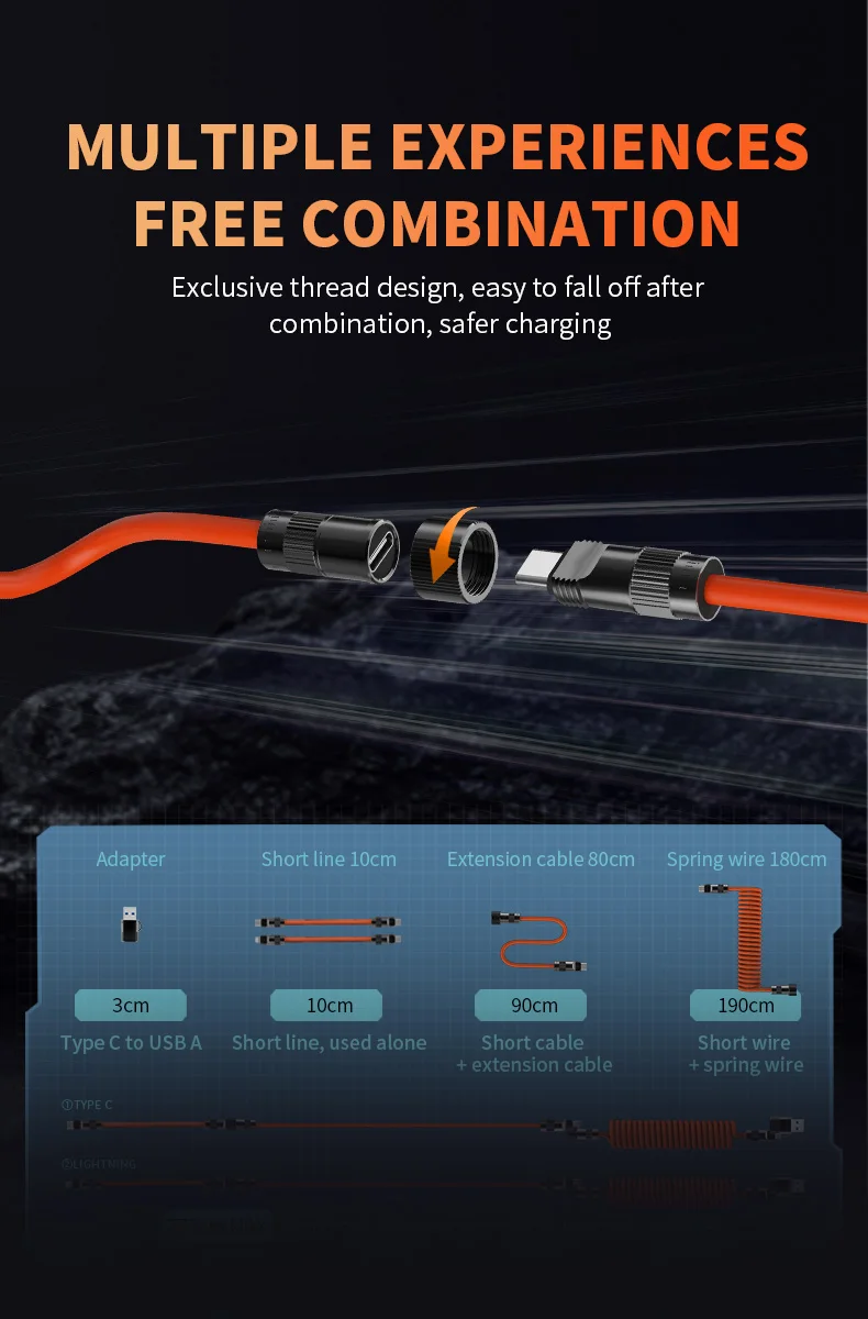 Es un juego de cables de carga rápida de silicona súper suave y duradero, mMúltiples formas de jugar, ¡haz tu propia longitud según sea necesario! Obtendrásun adaptador USB+cable C a L (10 cm)+cable C a C (10 cm)+cable de extensión C a C (80 cm)+cable de resorte C a C (180 cm)+una caja de almacenamiento.