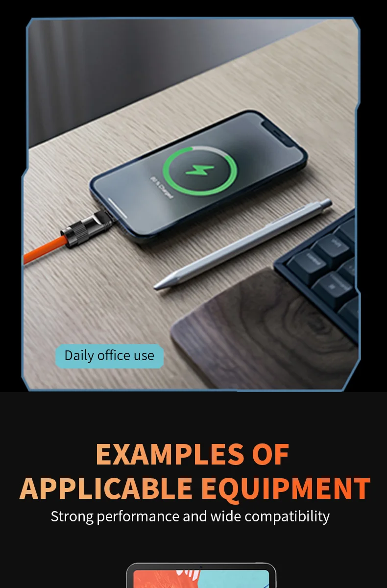 El juego de cables de silicona súper suaves USB-A, USB-C y Lightning incluía varios diferentesTipos y longitudes de cables de carga, admite carga rápida máxima de 240 W y PD3.1 y transmisión de datos de alta velocidad, un compañero ideal para uso doméstico y de oficina.