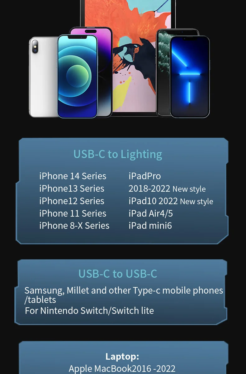 Este conjunto incluye diferentes tipos de cables de carga, casi compatibles con todos sus dispositivos, como iPhone 8-14, iPad Pro/Air, Macbook Pro/Air, Samsung, Nintendo Switch y más.