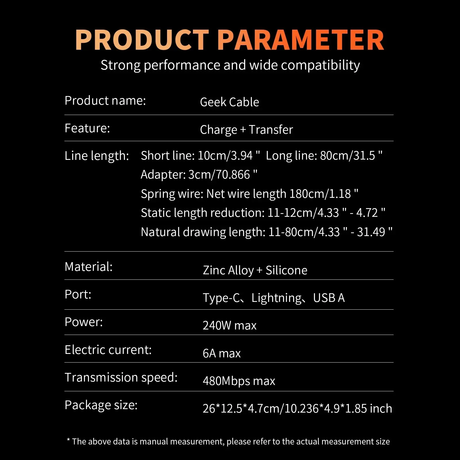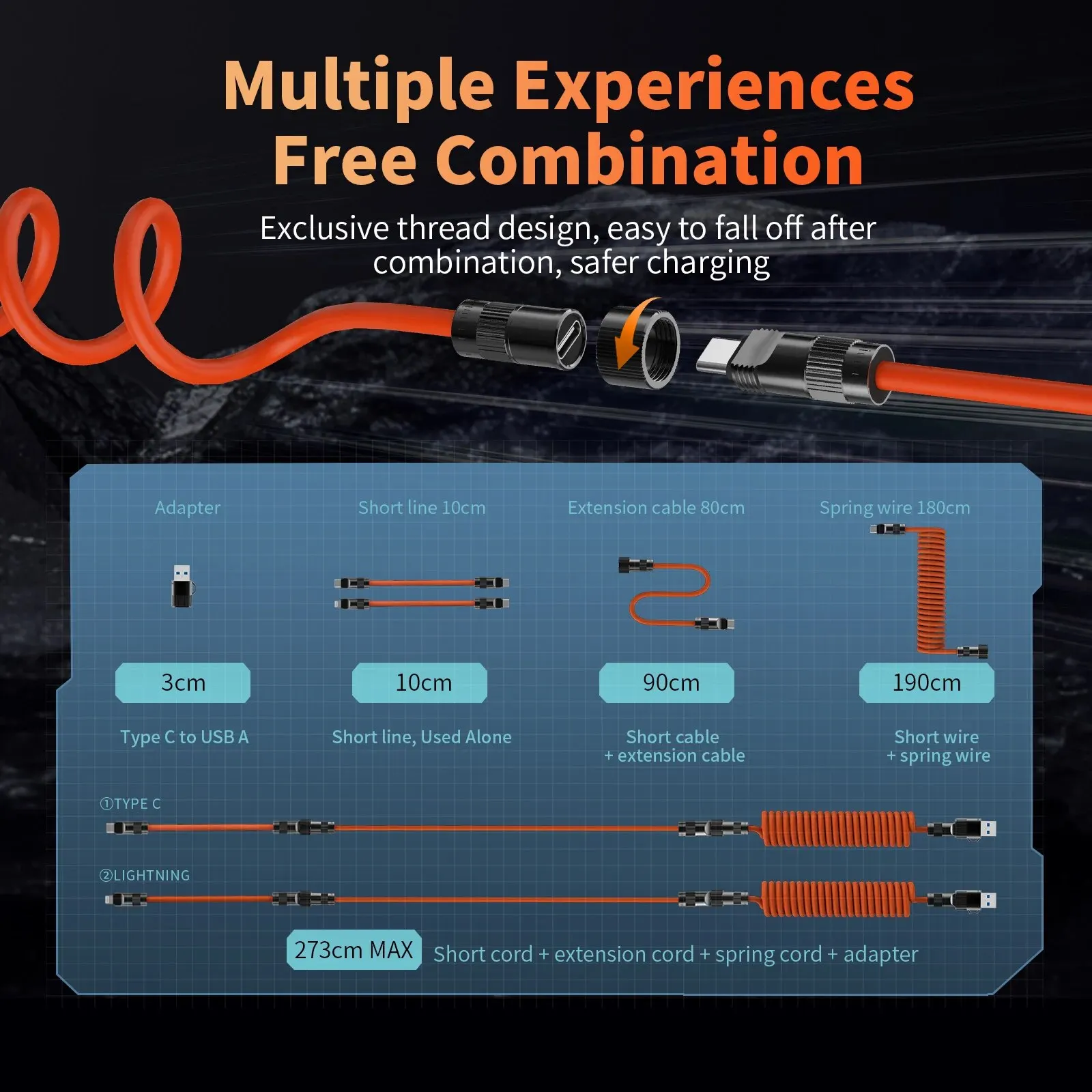 Es un juego de cables de carga rápida de silicona súper suave y duradero, mMúltiples formas de jugar, ¡haz tu propia longitud según sea necesario! Obtendrásun adaptador USB+cable C a L (10 cm)+cable C a C (10 cm)+cable de extensión C a C (80 cm)+cable de resorte C a C (180 cm)+una caja de almacenamiento.