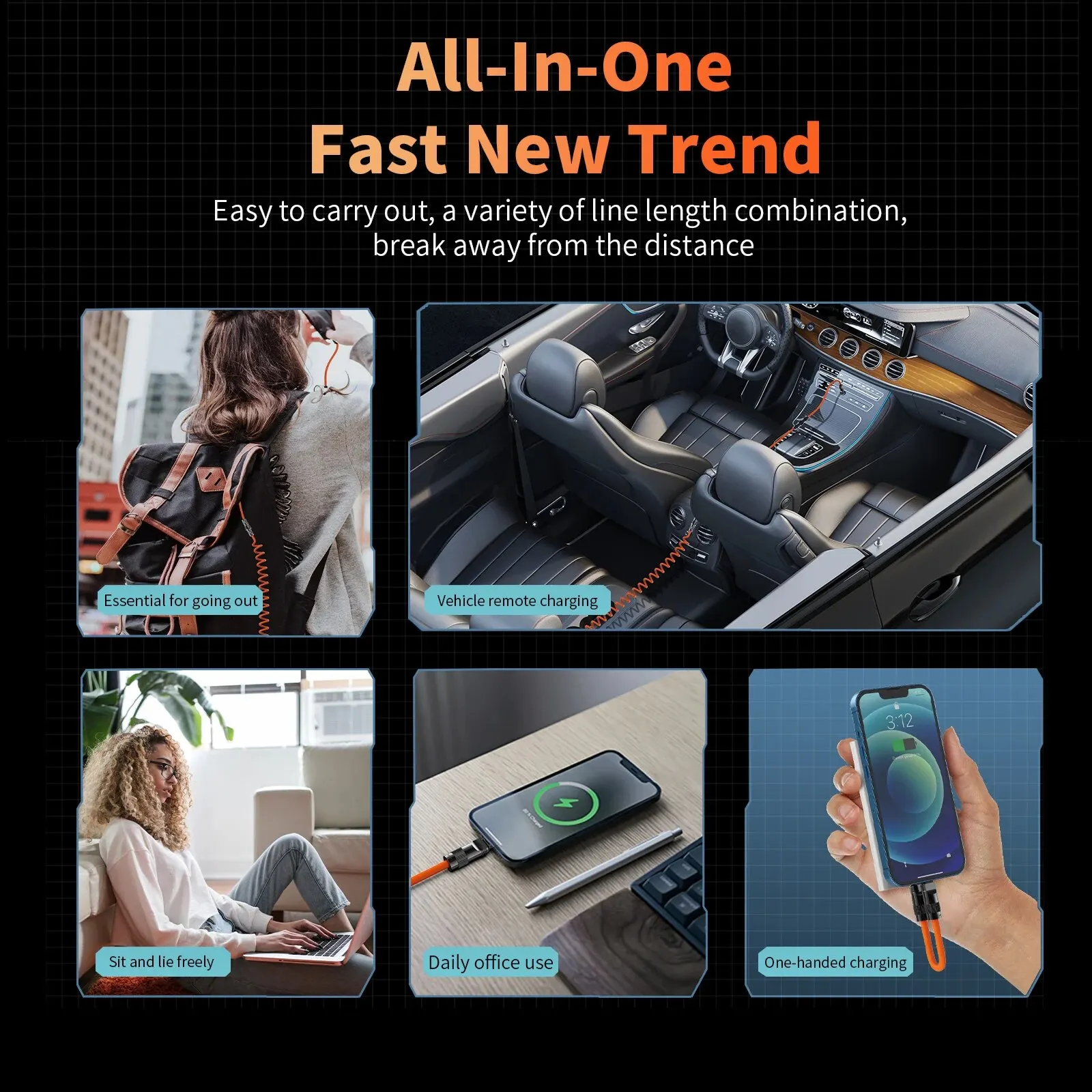 Este conjunto incluye diferentes tipos de cables de carga, casi compatibles con todos sus dispositivos, como iPhone 8-14, iPad Pro/Air, Macbook Pro/Air, Samsung, Nintendo Switch y más.