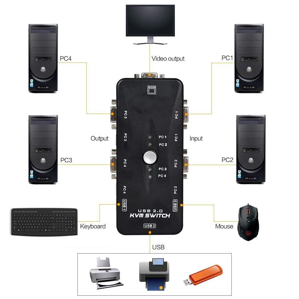 Comprar Juego de Cables de interruptor KVM + Hub de 4 puertos USB 2,0, adaptador de caja de interruptor KVM VGA/SVGA, CONEXIÓN DE TECLADO de impresora y ratón, 4 ordenadores, 1 Juego