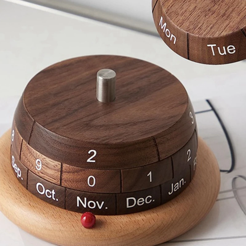 Embellecedor de madera de nogal con atención al detalle y todas las esquinas y bordes pulidos a mano, lo que lo convierte en una gran idea de regalo de oficina y vacaciones. Con esta estructura de diseño especial, el calendario de escritorio se puede utilizar para mostrar las fechas de todos los años.
