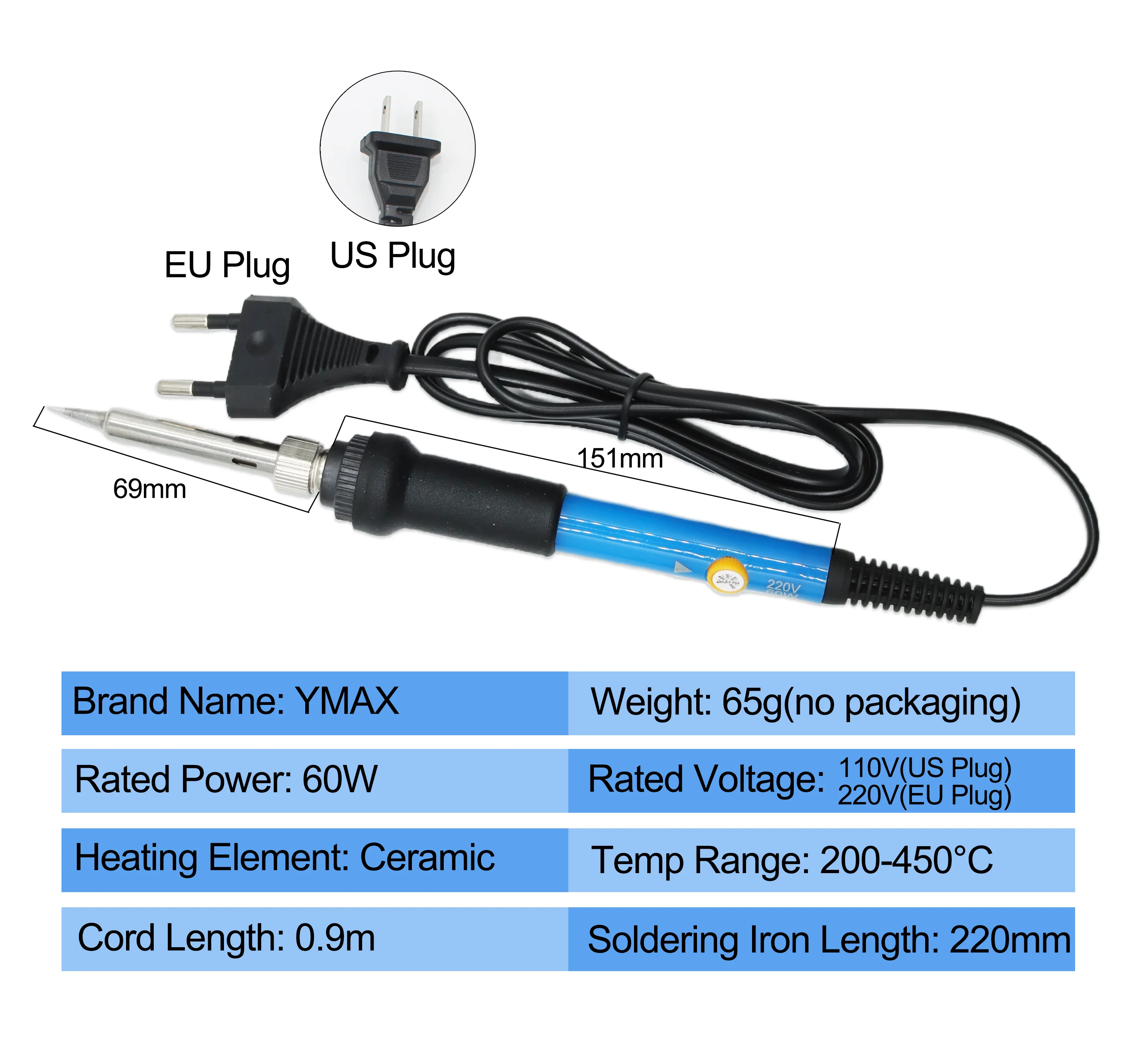 * Este soldador es una herramienta de soldadura de 60 W que puede funcionar a 180 °C-480 °C.La temperatura se puede ajustar en 1C.Tiene enchufes de la Unión Europea y América del Reino Unido para elegir.