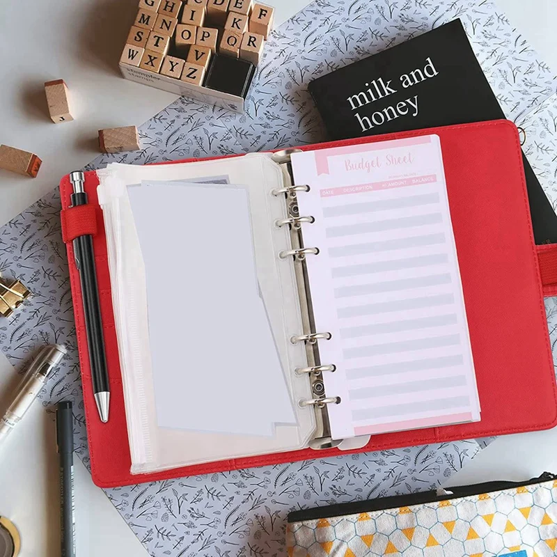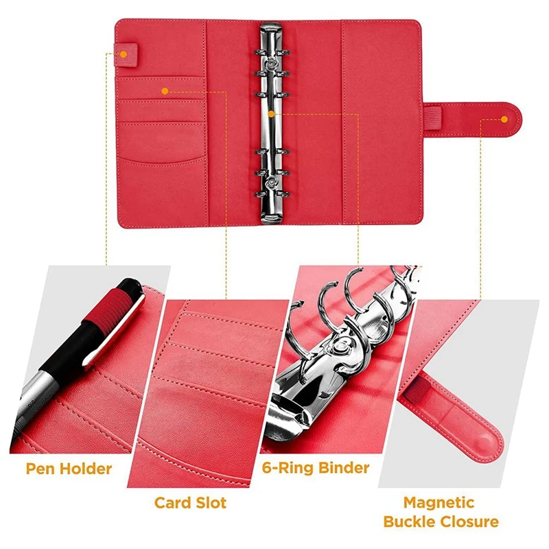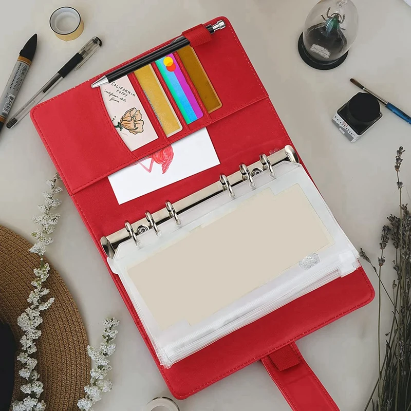 Juego de carpetas presupuestarias de cuero PU A6 de 50 piezas, carpeta de planificador Personal para ahorro de dinero Sistema de sobres en efectivo rojo