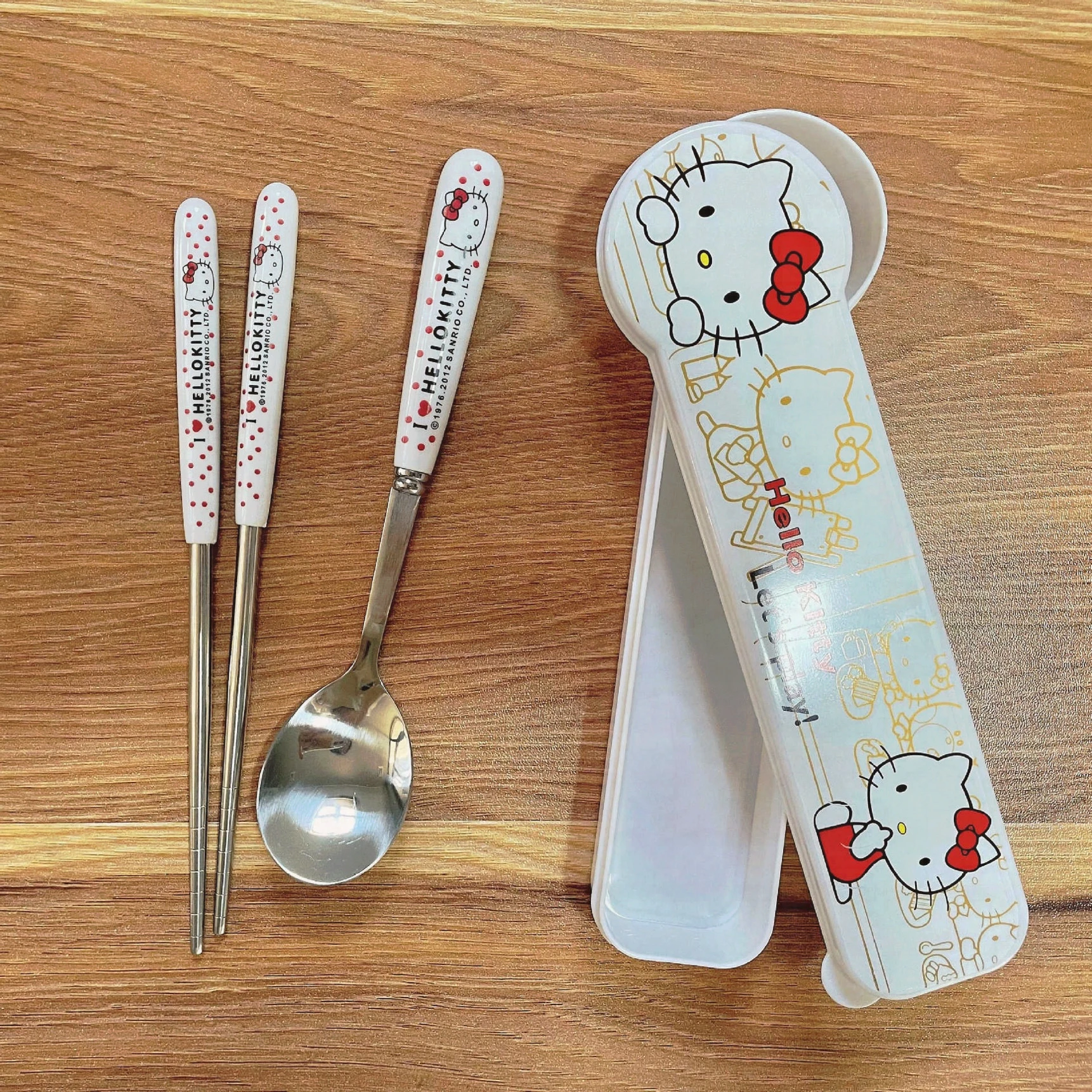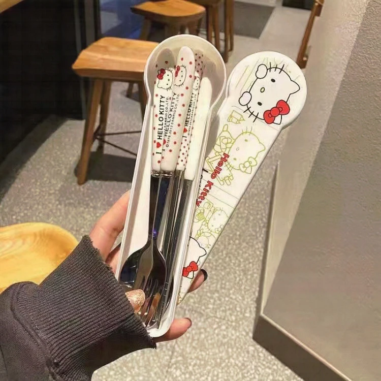 Comprar Juego de cuchara y palillos de alta apariencia de Hello Kitty con dibujos animados, vajilla portátil de viaje para estudiantes y trabajadores de oficina de acero inoxidable