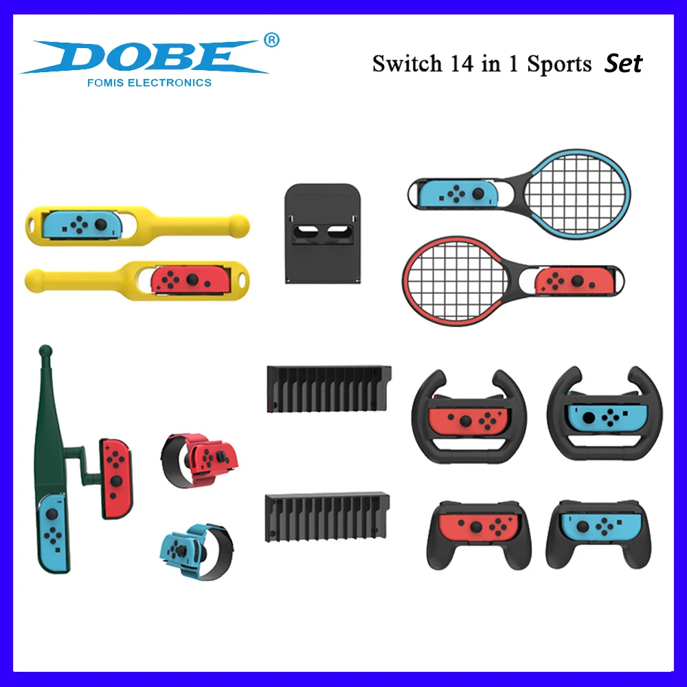 DOBE para Nintendo Switch 14 en 1 soporte de traje deportivo + agarre + volante + raqueta de tenis + PALO Taiko + correa de muñeca + estante de disco Embalaje: Caña de pescar x1 Soporte plegable x1 Palo de tambor x2 Correa de mano x2 Raqueta de tenis x2 Controlador Grip x2 Ccontroller rueda de carreras de x2 Soporte de almacenamiento de caja de tarjetas de juego x2