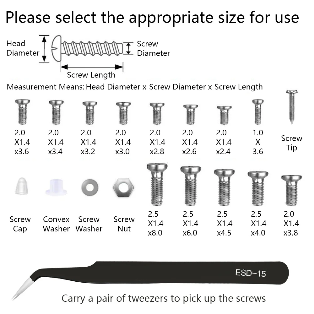 6.Kit completo de reparación de gafas con tamaños variados de tornillos, arandelas y tapas de tornillos para gafas.