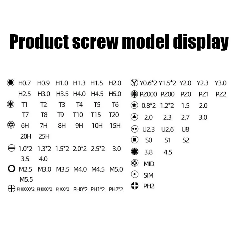 Torx: T1,T2*2,T3*2,T4*2,T5*2,T6,T7,T8,T9,T10,T15,T20,T6H,T7H,T8H,T9H,T10H,T15H