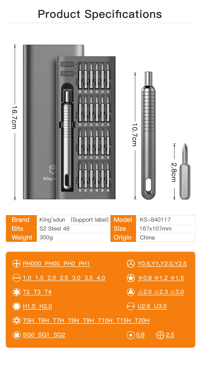 Torx :T2 T3 T4 TR5 TR6 TR7 TR8 TR9 TR10 TR15 TR20 Hex :0.7 0.9 1.3 1.5 2.0 2.5 3.0 3.5 4.0