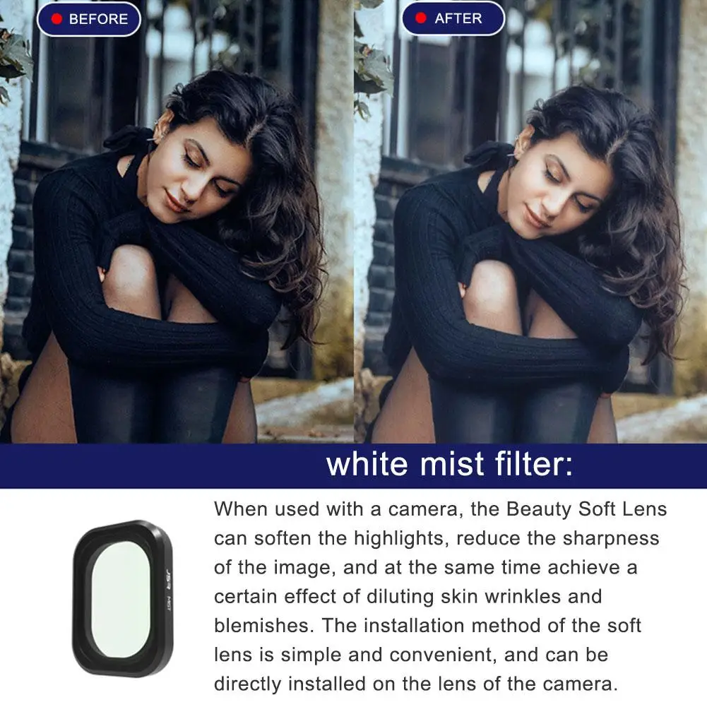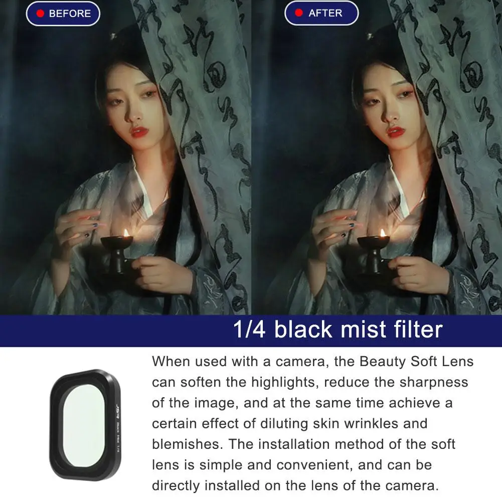 Cuando se utiliza con una cámara, la lente suave de belleza puede suavizar los reflejos, reducir la nitidez de la imagen y, al mismo tiempo, lograr un cierto efecto de dilución de las arrugas y manchas de la piel. El método de instalación de la lente blanda es simple y conveniente, y se puede instalar directamente en la lente de la cámara.