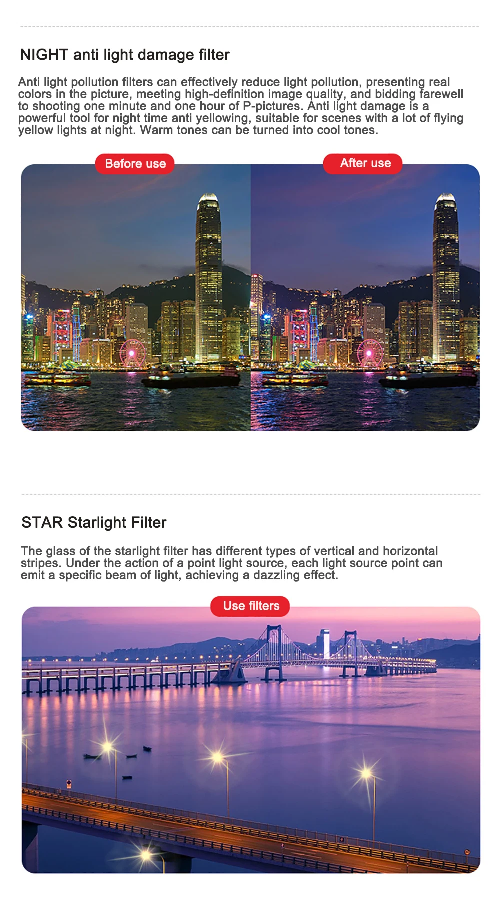 - El filtro anticontaminación lumínica puede reducir eficazmente la contaminación lumínica y hacer que la imagen muestre colores reales.El filtro anticontaminación lumínica elige material de vidrio óptico para cumplir con la calidad de imagen de alta definición.