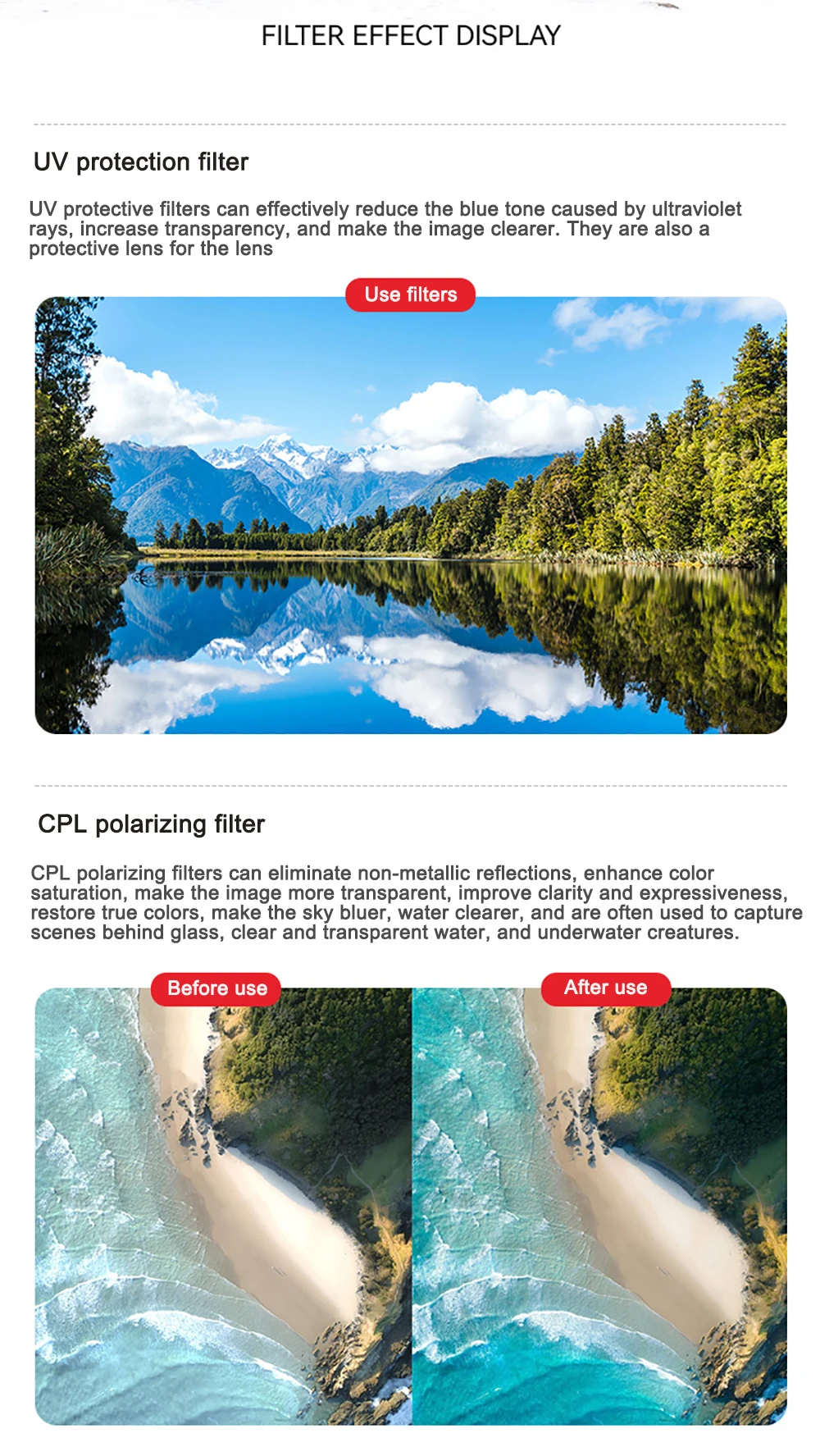 - El filtro UV es adecuado para disparar en la playa, montaña, campo de nieve y áreas abiertas, etc.Puede reducir el tinte azul causado por los rayos ultravioleta.Al mismo tiempo, para la cámara, también puede eliminar la interferencia de los rayos ultravioleta en el CCD, lo que ayuda a mejorar la claridad y la reproducción del color.