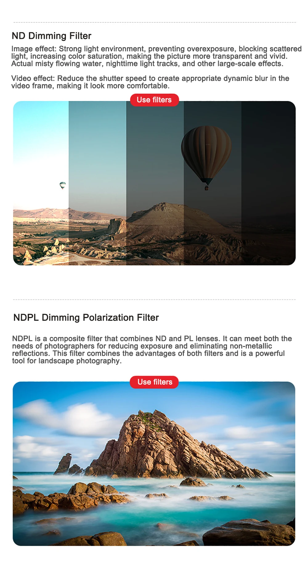 - Puede obtener más libertad para controlar la apertura y el obturador, brindar más espacio creativo para los métodos de exposición y prevenir eficazmente la sobreexposición.El número detrás de ND representa la capacidad de la lente ND para bloquear la luz.