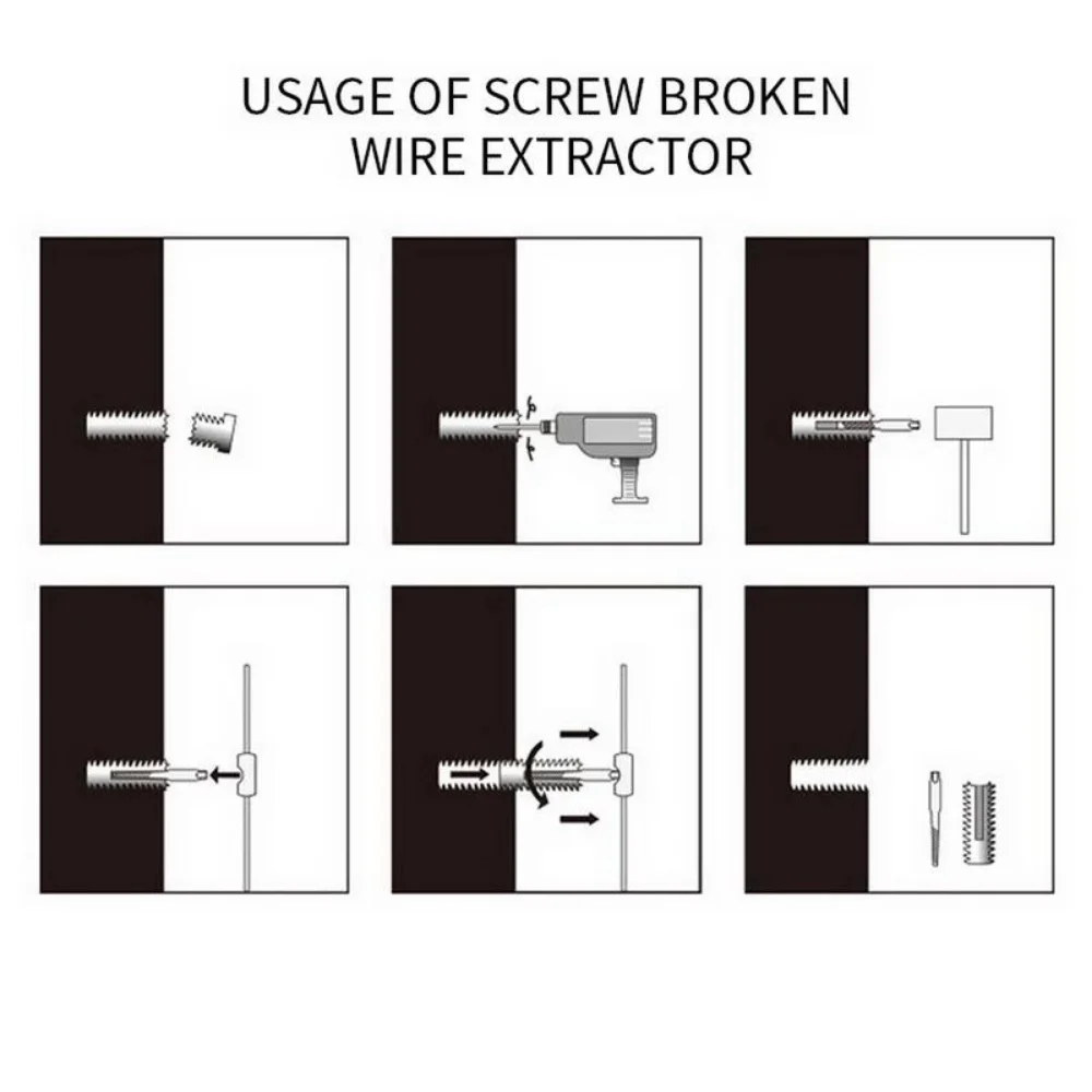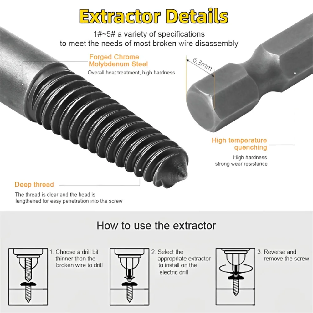 Características: Se incluyen extractores de tornillos de diferentes tamaños para satisfacer diferentes necesidades. La extracción de pernos y tuberías dañados se puede utilizar para quitar la mayoría de los tipos de tornillos dañados, pelados, oxidados, rotos o atascados con relativa facilidad de cualquier superficie de madera o metal.