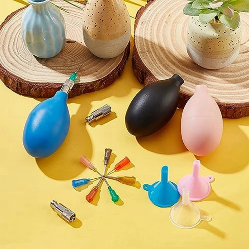 Juego práctico: obtendrá 3 botellas de punta de precisión, 3 embudos, 48 bases de tornillo de aguja en 8 tamaños de 14 a 24, 3 conectores de metal, dignos de su trabajo de hobby, para los amantes de la cerámica.