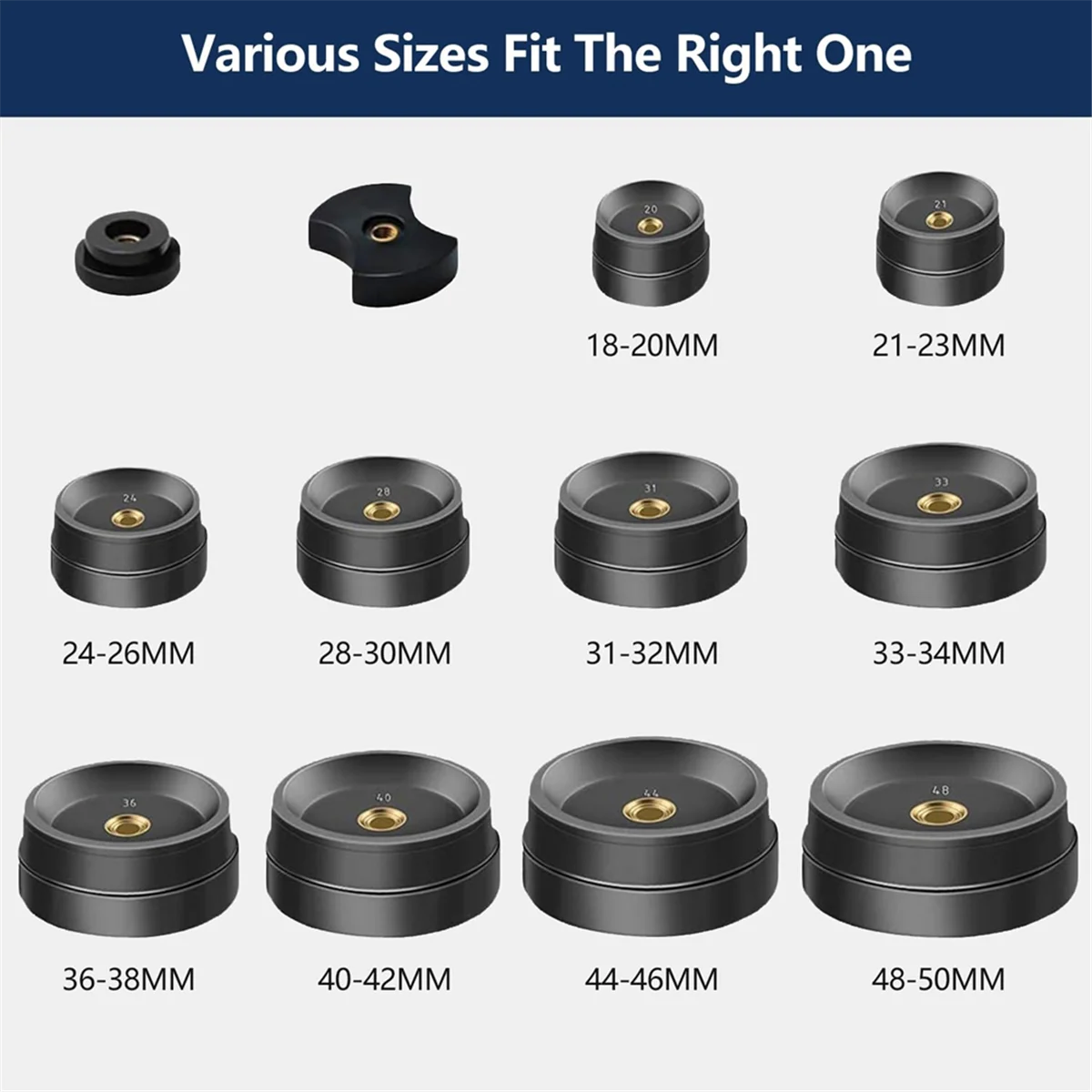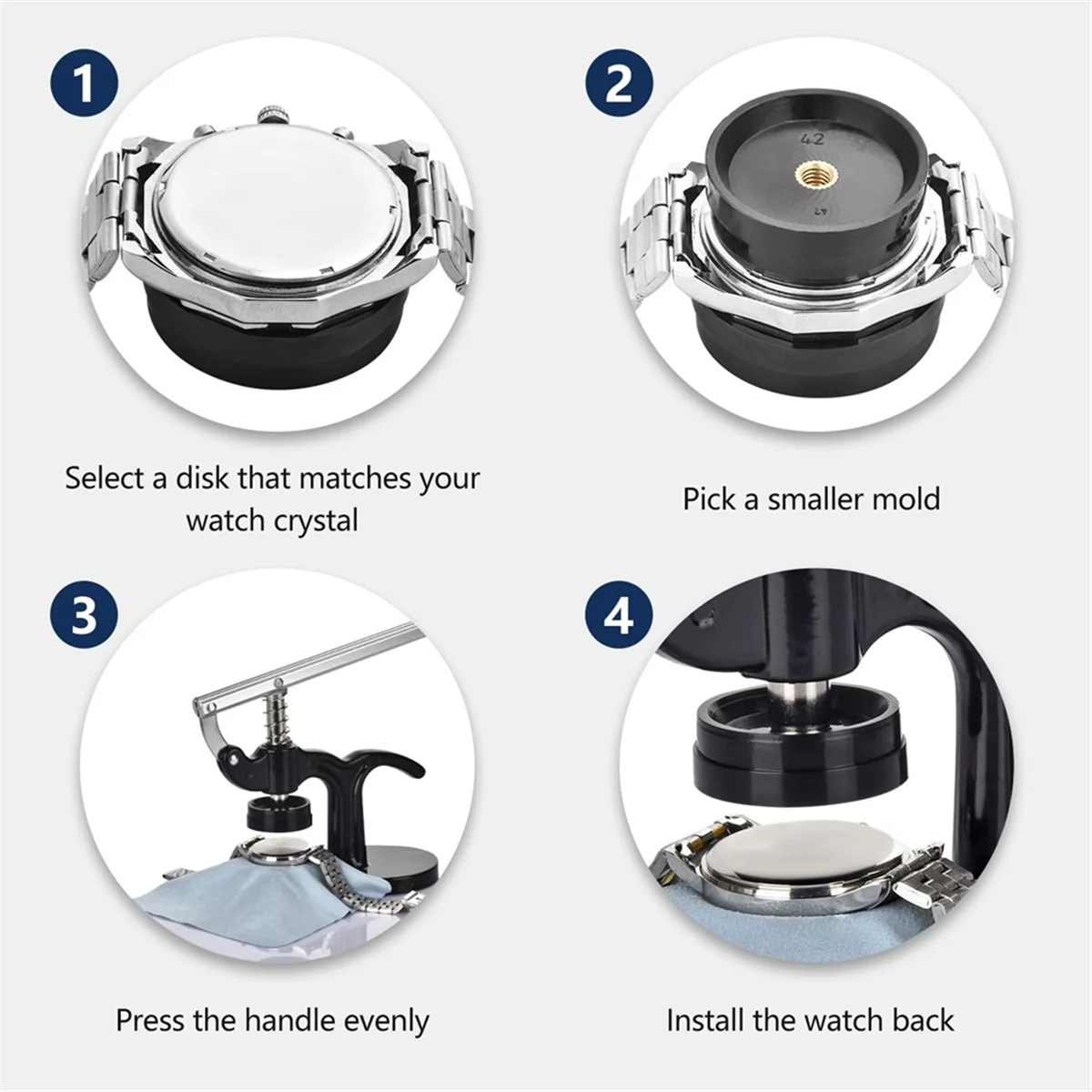 Las herramientas de estampado de cajas están hechas de materiales de alta dureza, resortes gruesos y moldes de plástico lisos. Proporciona una aplicación de fuerza sin esfuerzo y durabilidad FÁCIL DE USAR: El mecanismo de presión del reloj cierra la parte posterior del reloj en solo 3 sencillos pasos: elija el molde adecuado, coloque el reloj en el paño de limpieza, y presione el nivel para volver a colocar la parte posterior en su lugar. Accesorios adicionales: Mejora tu kit de reparación de relojes con nuestras dos púas de metal incluidas, que proporcionan comodidad y facilidad al abrir la caja del reloj, haciendo que la reparación del reloj sea fácil. GRAN REGALO: el kit de reparación de relojes es un gran regalo para los entusiastas y profesionales de los relojes. Esta es una gran opción para Navidad, cumpleaños, Día del Padre y otros días festivos. Material: plástico + metal color: Negro + azul Contenido del paquete: 1 x prensador de Caja 2 x cuchillas abiertas de caja 12 x troqueles (de 18mm para acomodar a 50mm varios tamaños de reloj). 1 x paño de limpieza (coloreado aleatoriamente. No se puede elegir el color específico.) Solo el contenido del paquete anterior, otros artículos no están incluidos. Nota: El reflejo de la luz y las diferentes pantallas pueden hacer que el color del elemento en la imagen sea un poco diferente del real. El error de medición permitido es +/- 1-3cm.