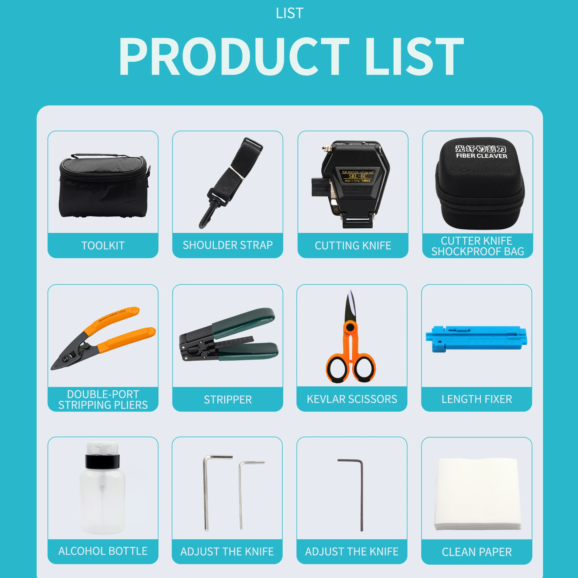 Comprar Juego de Kit de herramientas FTTH de 12 uds, bolsa de traje de fusión en caliente, cuchilla de fibra de SKL-6C con Pelacables