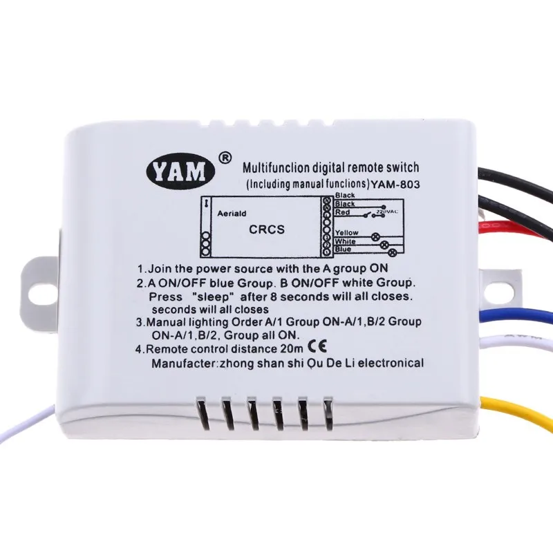 Características: Perfecto para el control remoto de droplight, lámpara de cristal, lámpara moderna de baja presión, luz de techo absorbente, lámpara de flor de día, lámpara fluorescente, lámparas de ahorro de energía, ventilador de escape, luz LED, etc. Instalación rápida y fácil, no obstruida por paredes, capaz de conectar cualquier carga. El mando a distancia y el interruptor se pueden utilizar simultáneamente para mayor facilidad y flexibilidad. Cada juego de interruptores de control remoto tiene su código especial. Se pueden usar más juegos en una habitación sin interferencias. Interruptor de control remoto unidireccional: Especificaciones: Distancia de control remoto: dentro de 30m Voltaje de entrada: 180-240V Carga de cada puerto: lámpara fluorescente: 600W; lámpara de ahorro de energía: 300W Temperatura de trabajo:-20C + 60c Material: ABS Tamaño: mando a distancia: 11M * 4,2 cm * 1,5 cm; dispositivo principal: 6,0 cm x 4,5 cm x 2,5 cm Potencia: batería de 12V 23A (no incluida) Interruptor de control remoto bidireccional: Función: 1.A/1 se encenderá después del encendido. 2. A/1 se usa para encender/apagar el grupo azul, B/2 se usa para encender/apagar el grupo verde, "ON"/"OFF" significa encender/apagar todo el artículo. 3. Secuencia de iluminación manual (control del interruptor de pared): A / 1 , B / 2, se encenderá todo el circuito. Especificaciones: 1. Cada Grupo puede llevar la bombilla incandescente de 1000W y la lámpara de ahorro de energía de 300W. 2. Voltaje de funcionamiento:/60Hz 3. Batería de control remoto: batería de 12V 23A (batería no incluida) 4. Distancia de control remoto: 30m 5. Potencia de carga: 1 6. Carga resistiva: la mayor potencia de salida de un solo grupo dentro de 3000W.(Como luz incandescente o bombilla, etc.) Interruptor de control remoto de tres vías: Función: 1.A/1 se encenderá después del encendido. 2. A/1 usa para encender/apagar el grupo azul, B/2 usa para encender/apagar el grupo blanco, C/2 usa para encender/apagar el grupo amarillo, "ON"/"OFF" significa encender/apagar todo el artículo. 3. Secuencia de iluminación manual (control del interruptor de pared): A/1 , B/2 , C/3, se encenderá todo el circuito. Especificaciones: 1. Voltaje de funcionamiento:/60Hz 2. Batería de control remoto: batería de 12V 23A (batería no incluida) 3. Distancia de control remoto: (Interior) superior a 20-30m 4. Potencia de carga: 1 5. Carga resistiva: la mayor potencia de salida de un solo grupo dentro de 1000W.(Como luz incandescente o bombilla, etc.) |