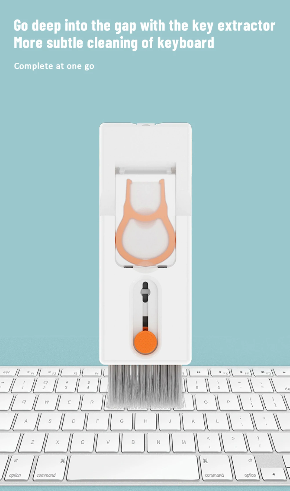 Coopere con el dispositivo de recogida de claves para penetrar profundamente en el espacio y limpiar el teclado más finamente.