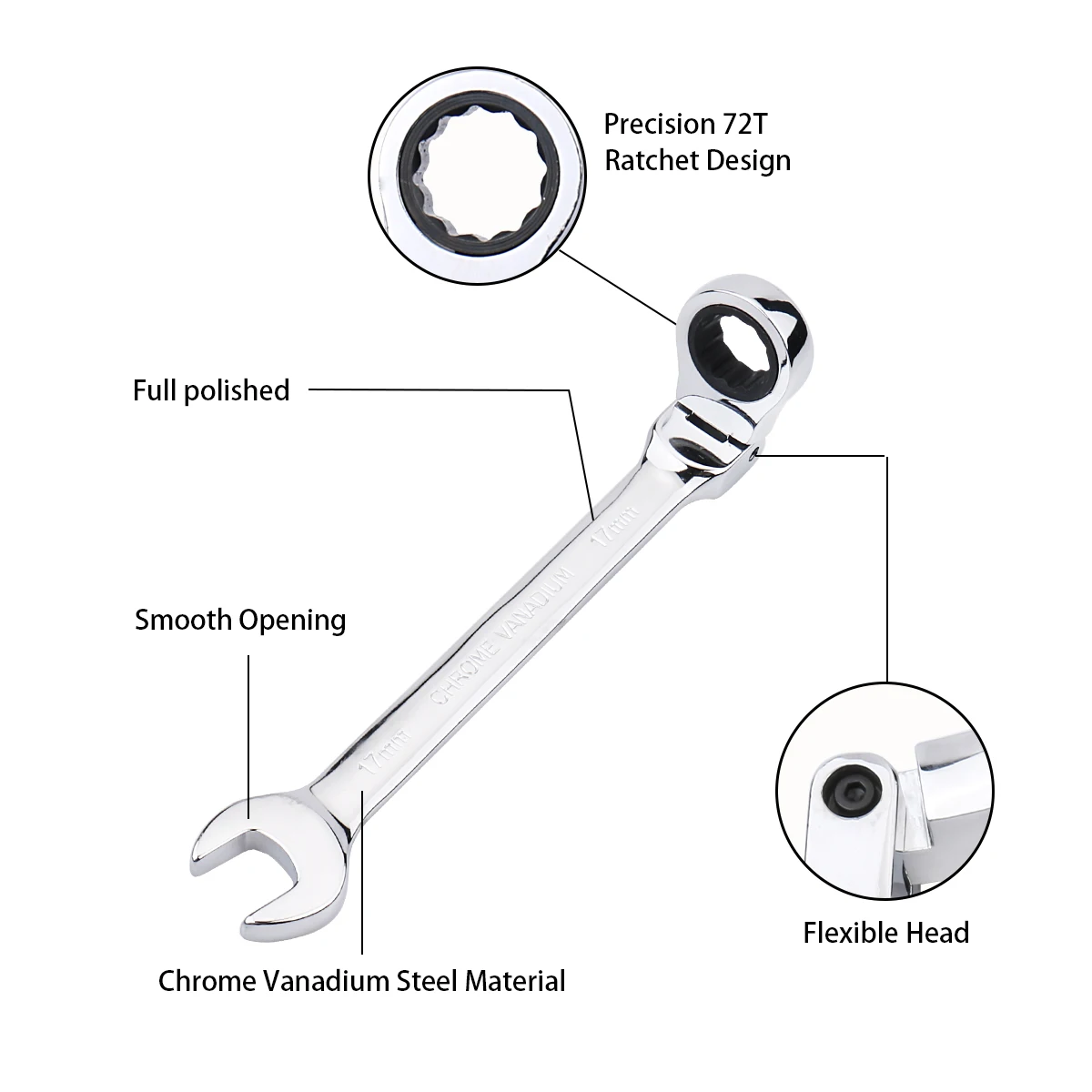 Llave de trinquete de llaves Juego de llaves Herramienta de mano 72 dientes Trinquete Cabeza flexible Acabado de espejo