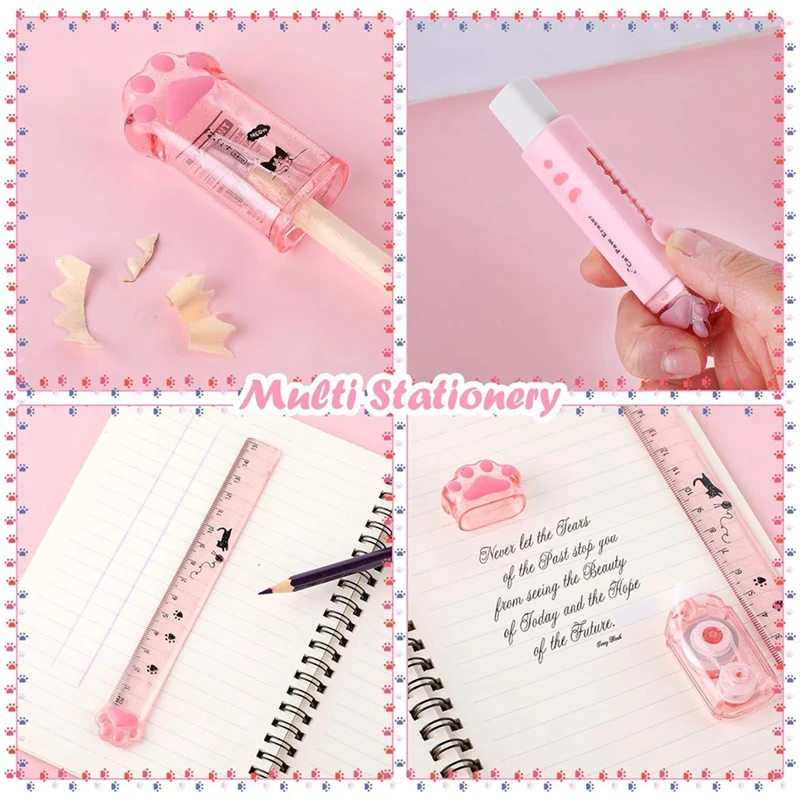 Comprar Juego de papelería con forma de pata de gato, 6 piezas, Kawaii, Kit de papelería, sacapuntas retráctil, goma de borrar, cinta de corrección, regla duradera