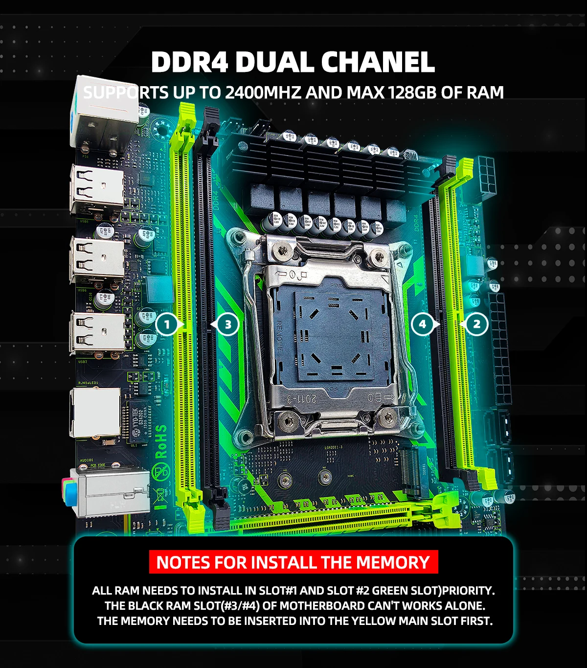 Para instalar la memoria. TODAS las RAM deben instalarse en la ranura # 1 y ranura # 2 ranura verde)prioridad. La ranura RAM negra ( # 3/ # 4) de la placa base no puede funcionar sola. Primero debe insertarse la memoria en la ranura principal amarilla.