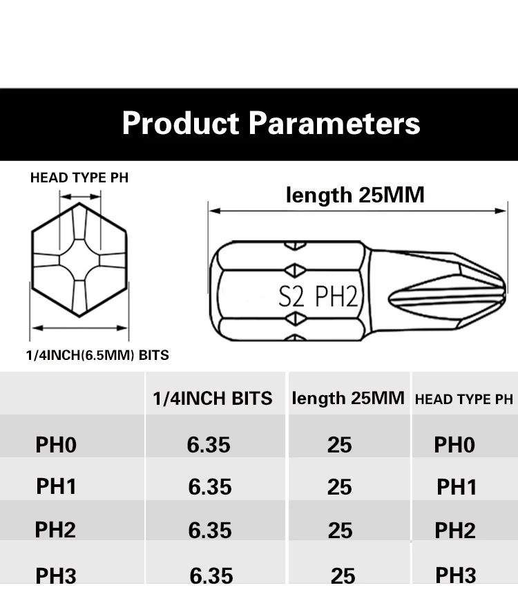 Punta de destornillador Phillips PH0 PH1 PH2 PH3, acero S2, 1/4 pulgadas, 6,35mm, puntas de destornillador eléctrico con vástago hexagonal para herramientas eléctricas, 1 pulgada