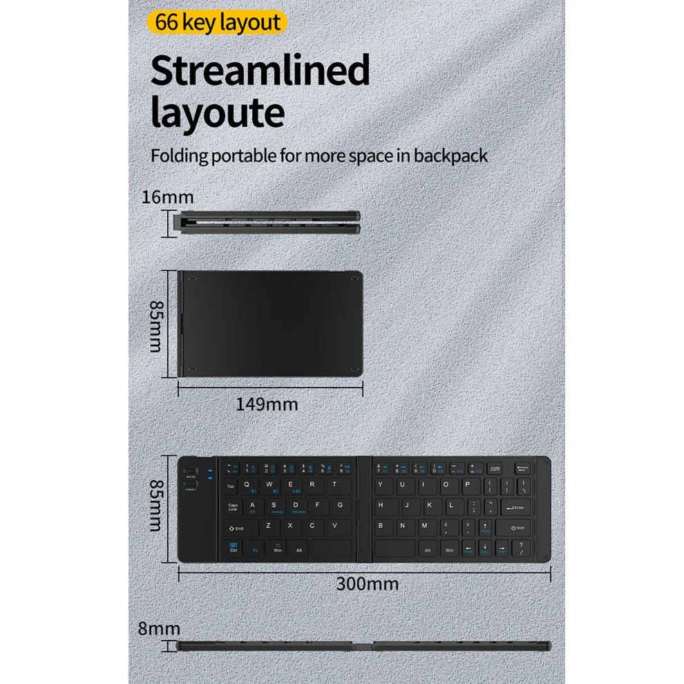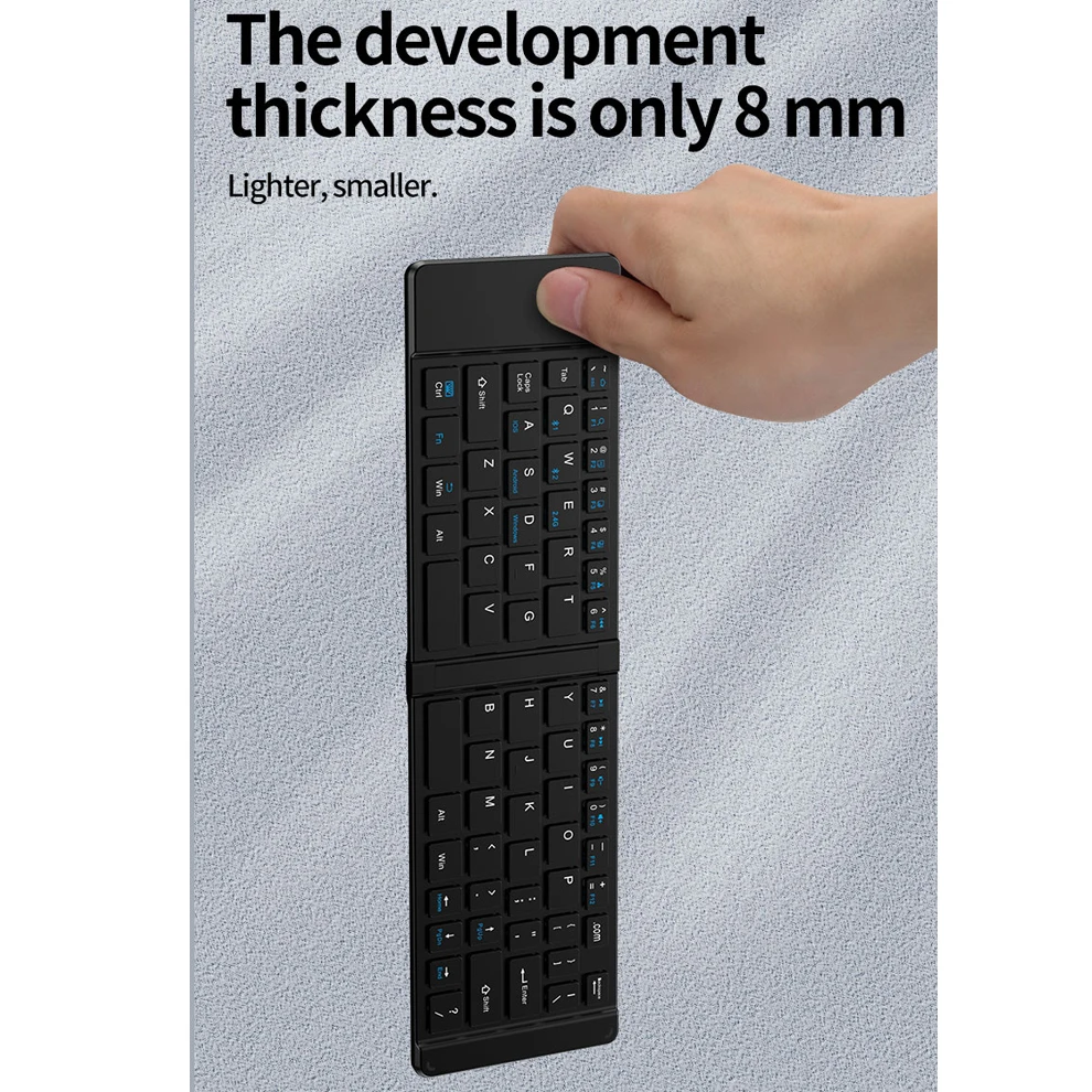 Batería recargable y ultralarga duración: tanto el teclado como el mouse se pueden cargar mediante USB tipo C de forma inalámbrica, lo que dice adiós al reemplazo frecuente de la batería.El teclado plegable tarda 2 horas en cargarse, tiene un tiempo de espera ultralargo de 114 días, puede funcionar de forma continua 44 horas y también cuenta con un modo de suspensión de ahorro de energía, lo que ahorra energía y es altamente eficiente.