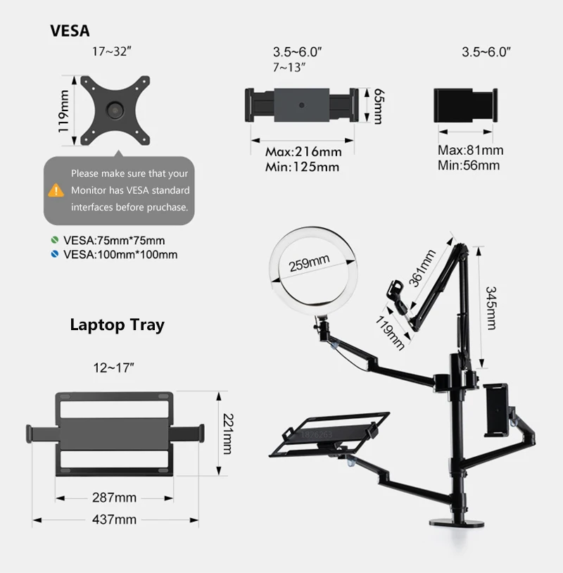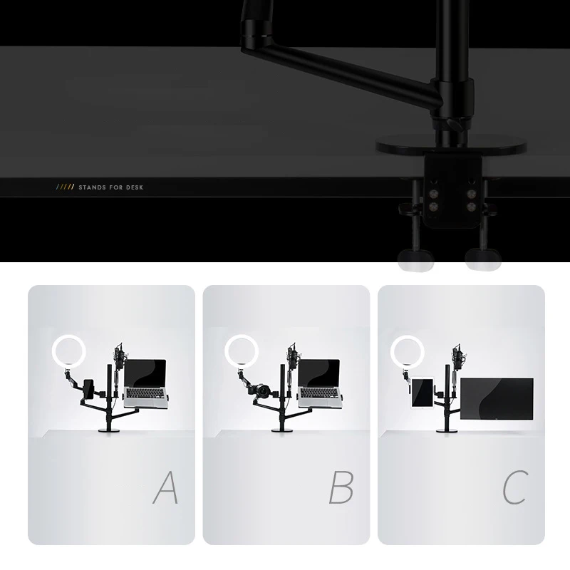 Desktop Live Stand Set 6-en-1 10 "LED Ring Light Micrófono Mount competible con 12-17" laptop/17-32 ''monitor/7-13 Tablet/3,5-6,7" Phone/Cámara digital DSLR Reunión de enseñanza en línea
