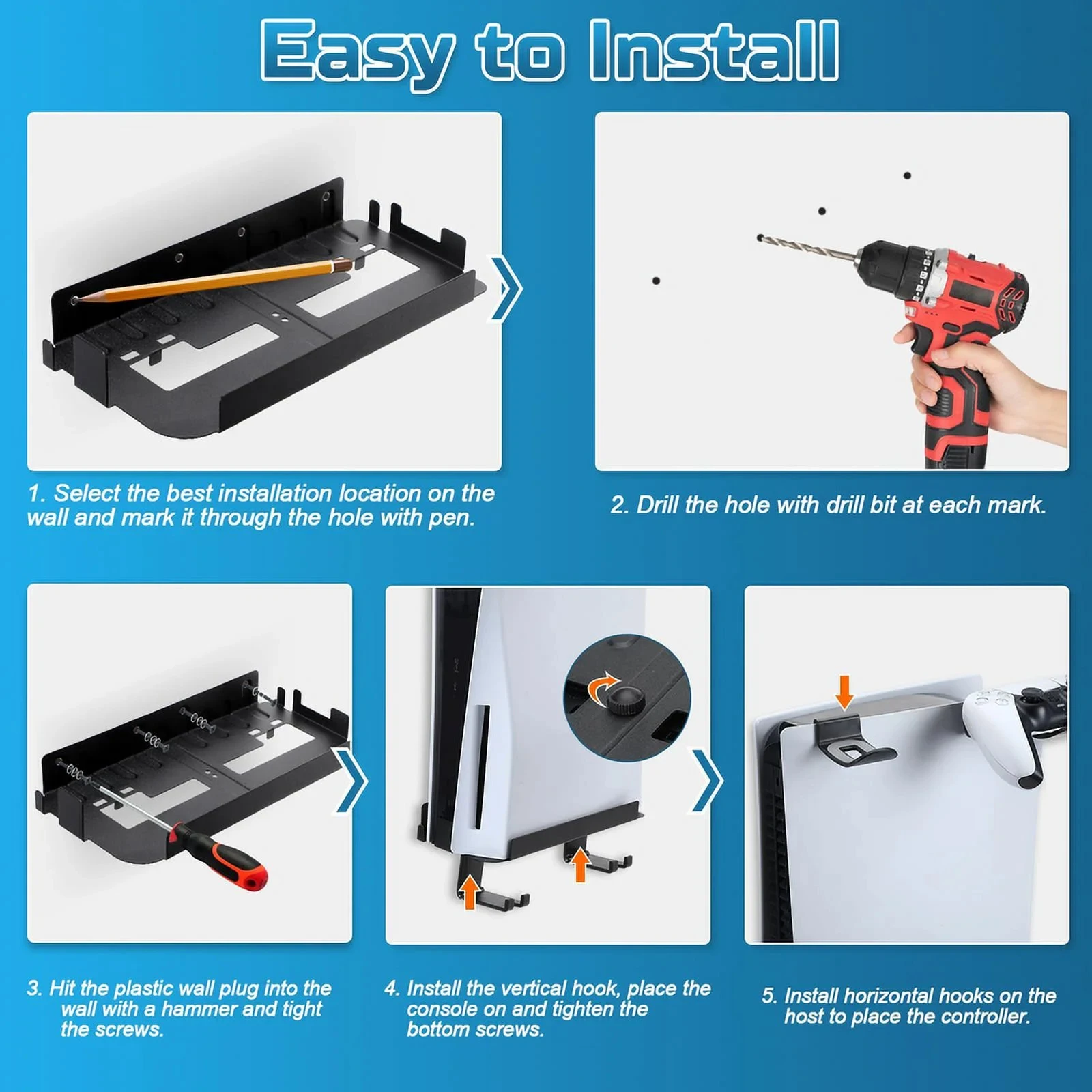 Fácil de instalar-- Nuestro soporte de montaje en pared para Playstation 5 tiene 4 orificios de soporte, 4 paredes