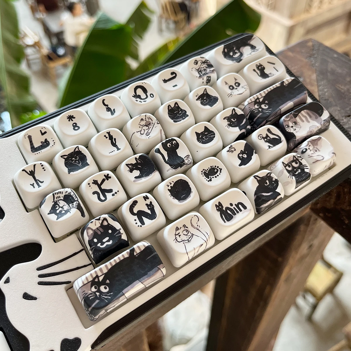 Juego de teclas temáticas lindas de gato Tai Chi, color blanco y negro, perfil PBT Cherry MOA, teclas originales hechas a mano personalizadas para teclado mecánico