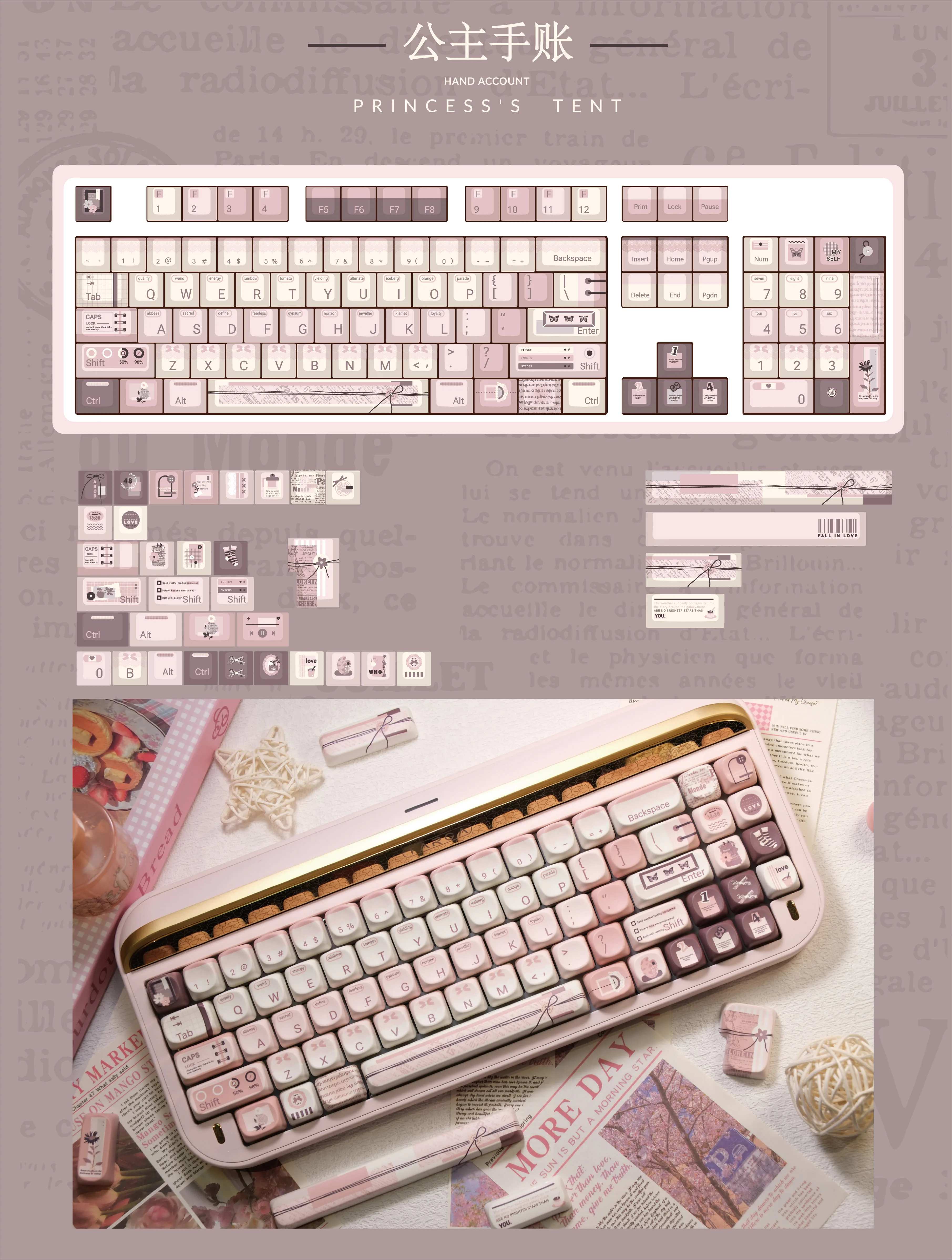 Conjunto de teclas temáticas de Manual de princesa, sublimación PBT SOA, teclas de perfil de cereza, tapas de teclado, accesorios personalizados