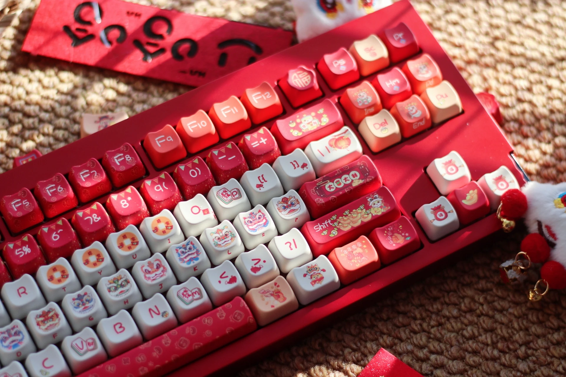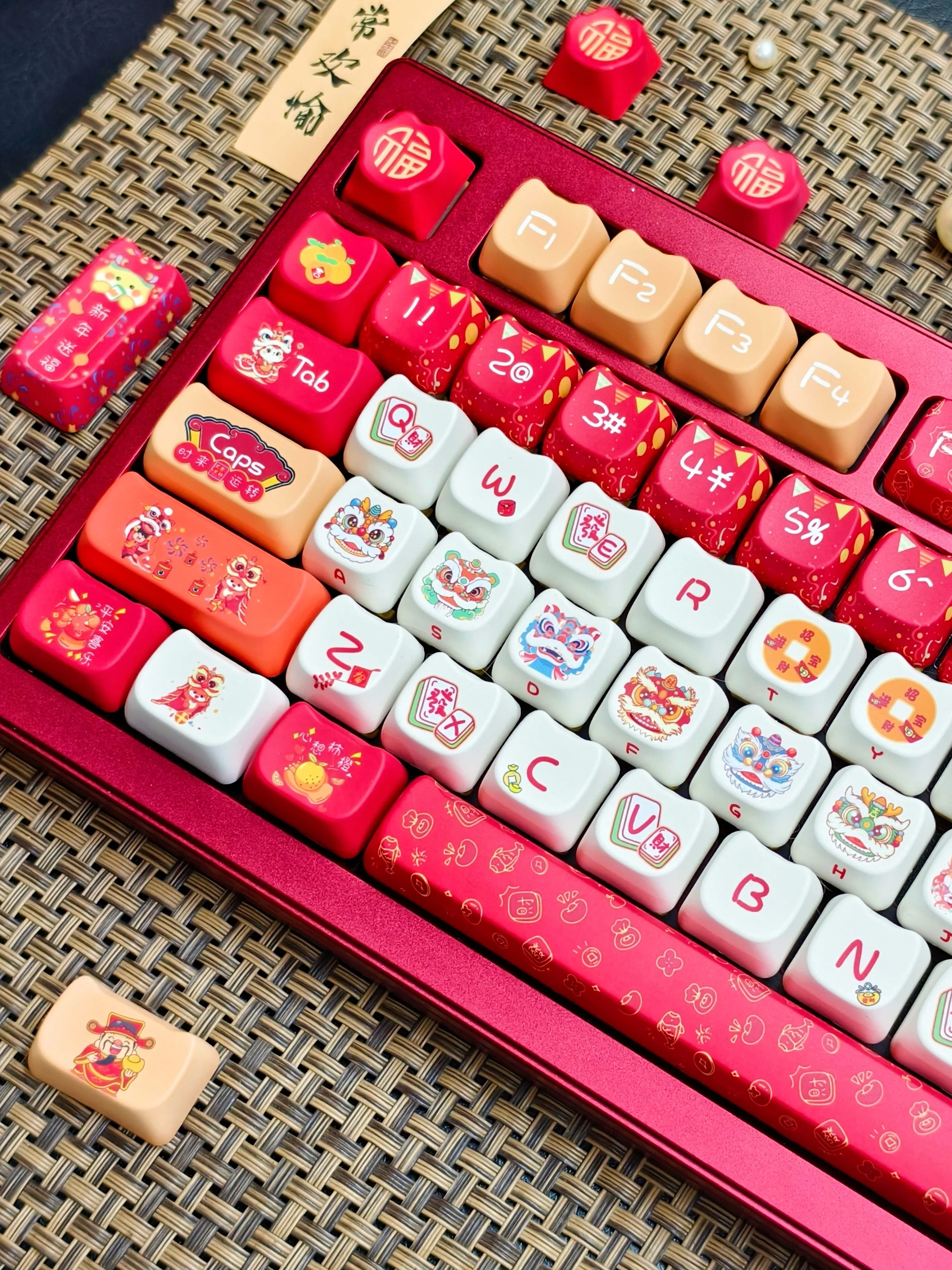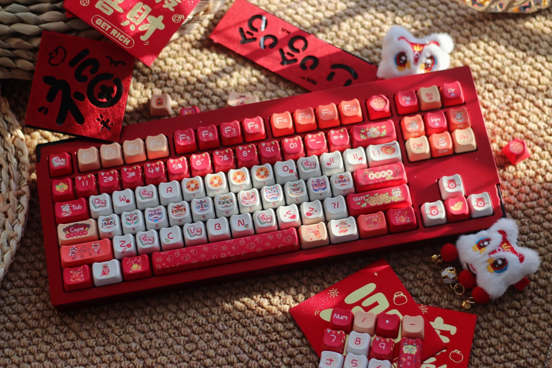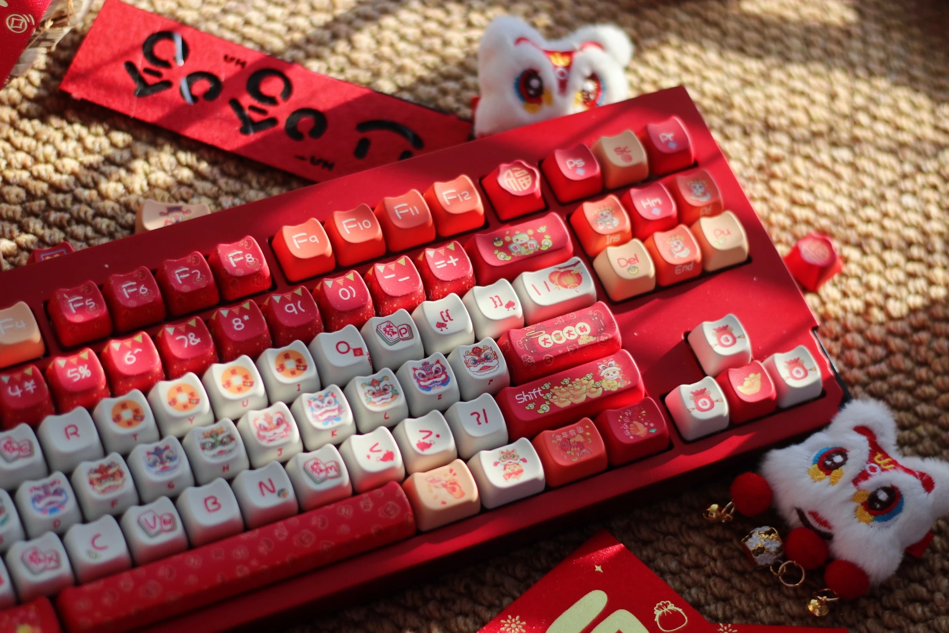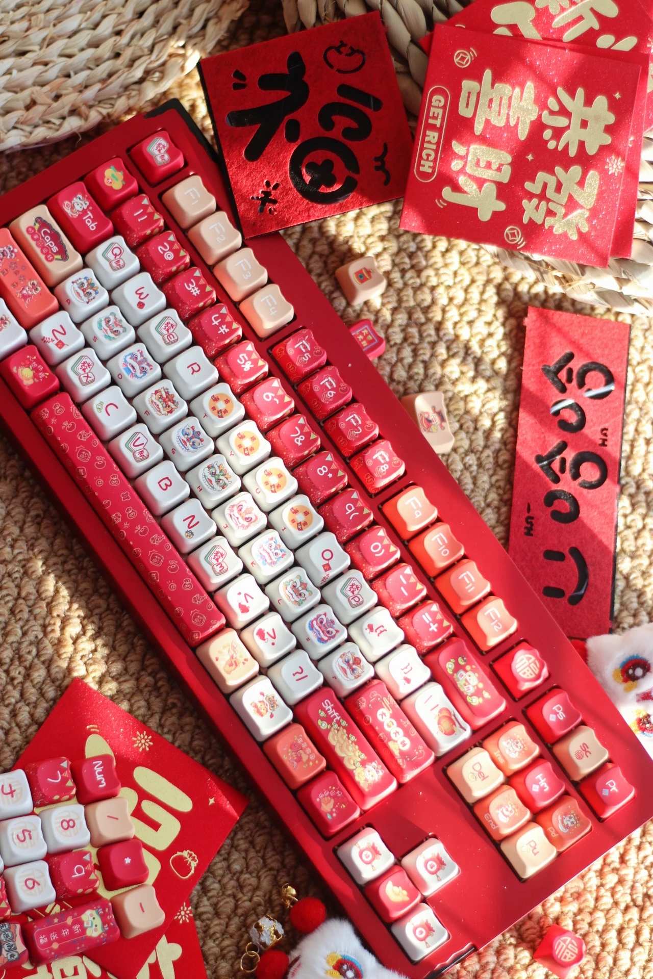 Juego de teclas con tema rojo de Año Nuevo, perfil MAO, lindas teclas con orejas de gato, sublimación térmica PBT, danza del león, teclas de teclado mecánico