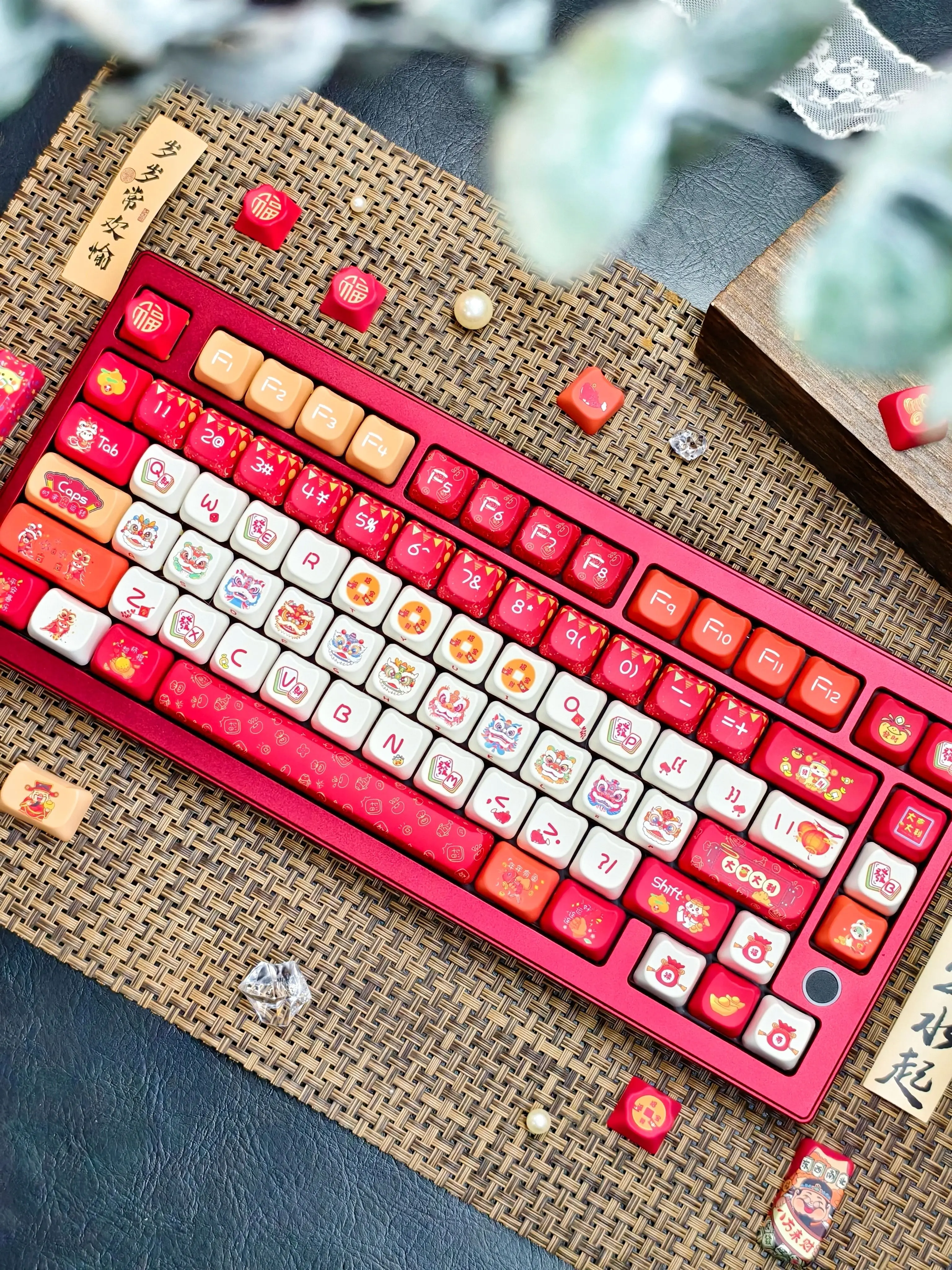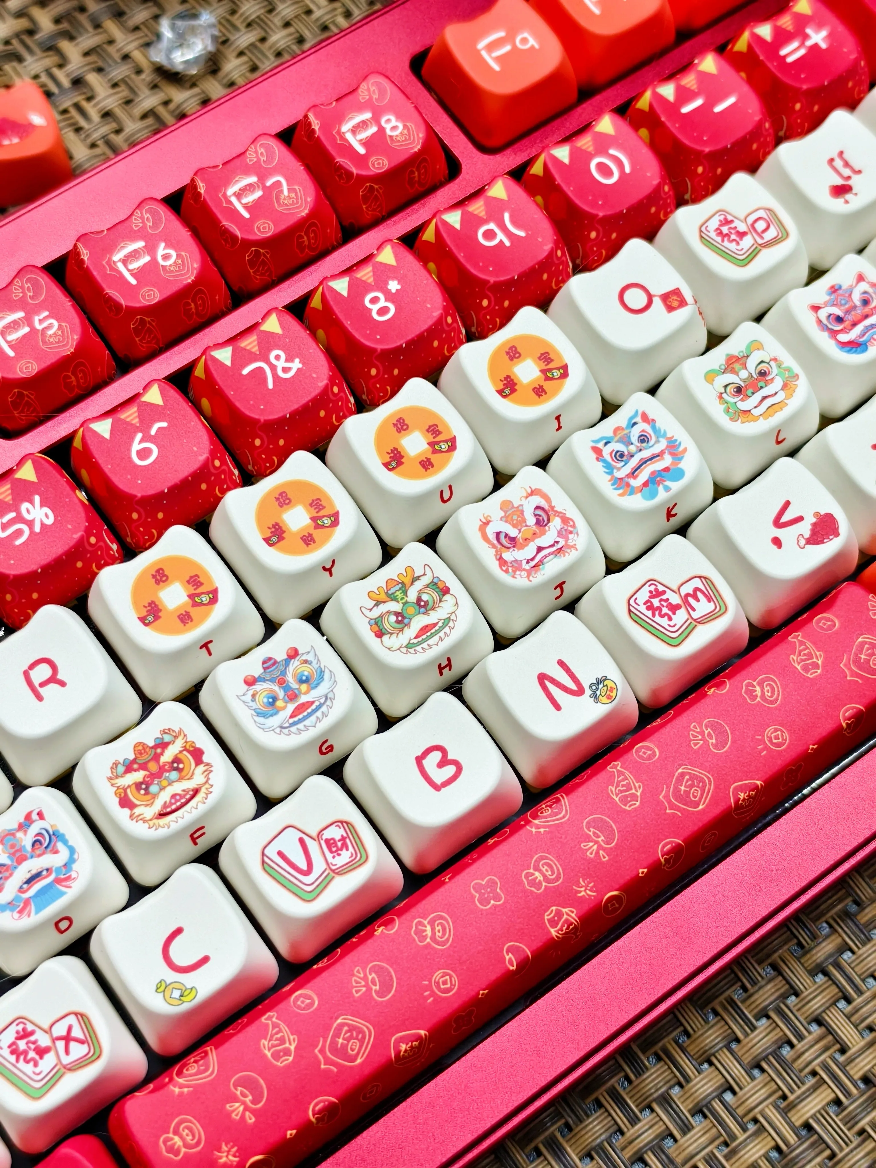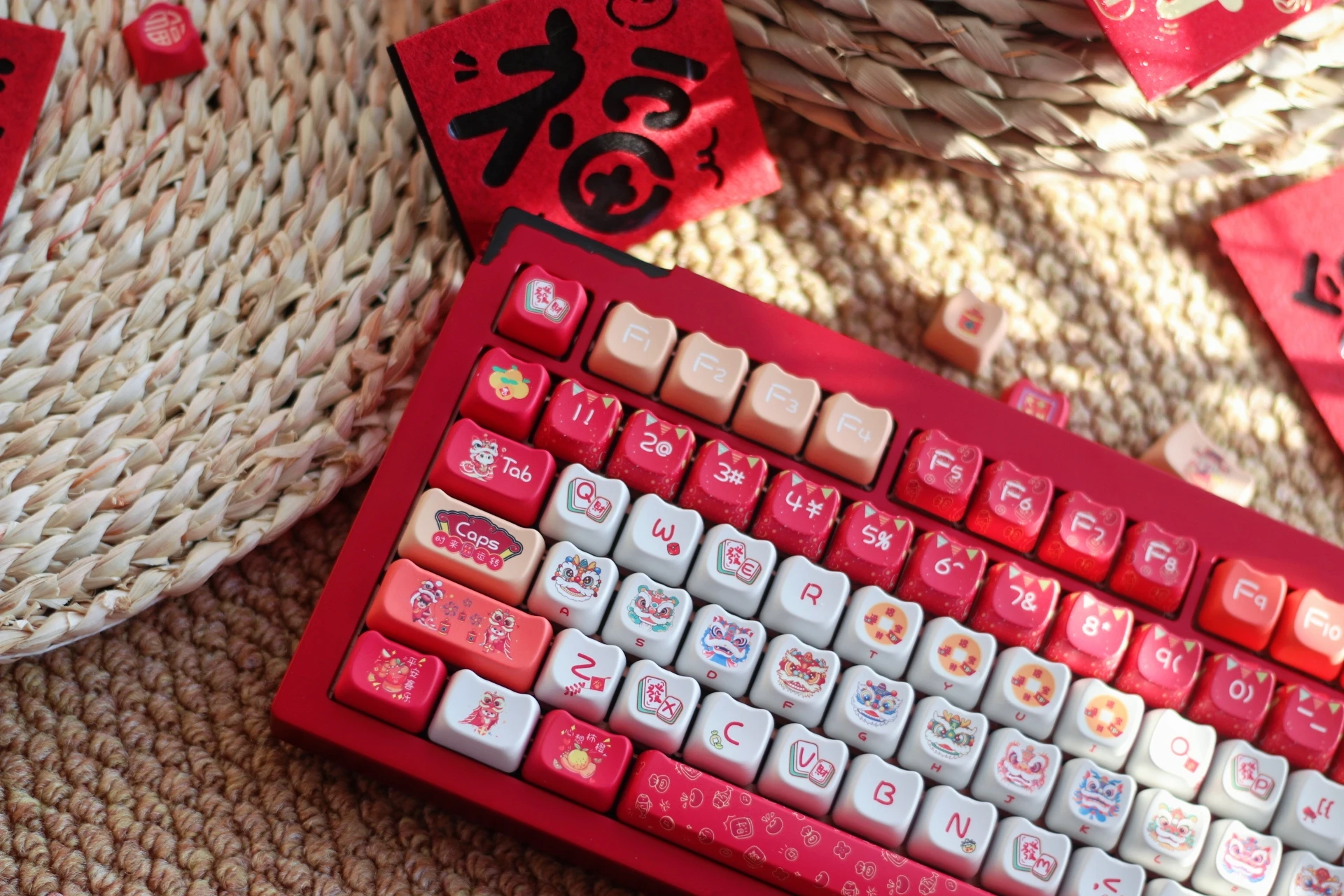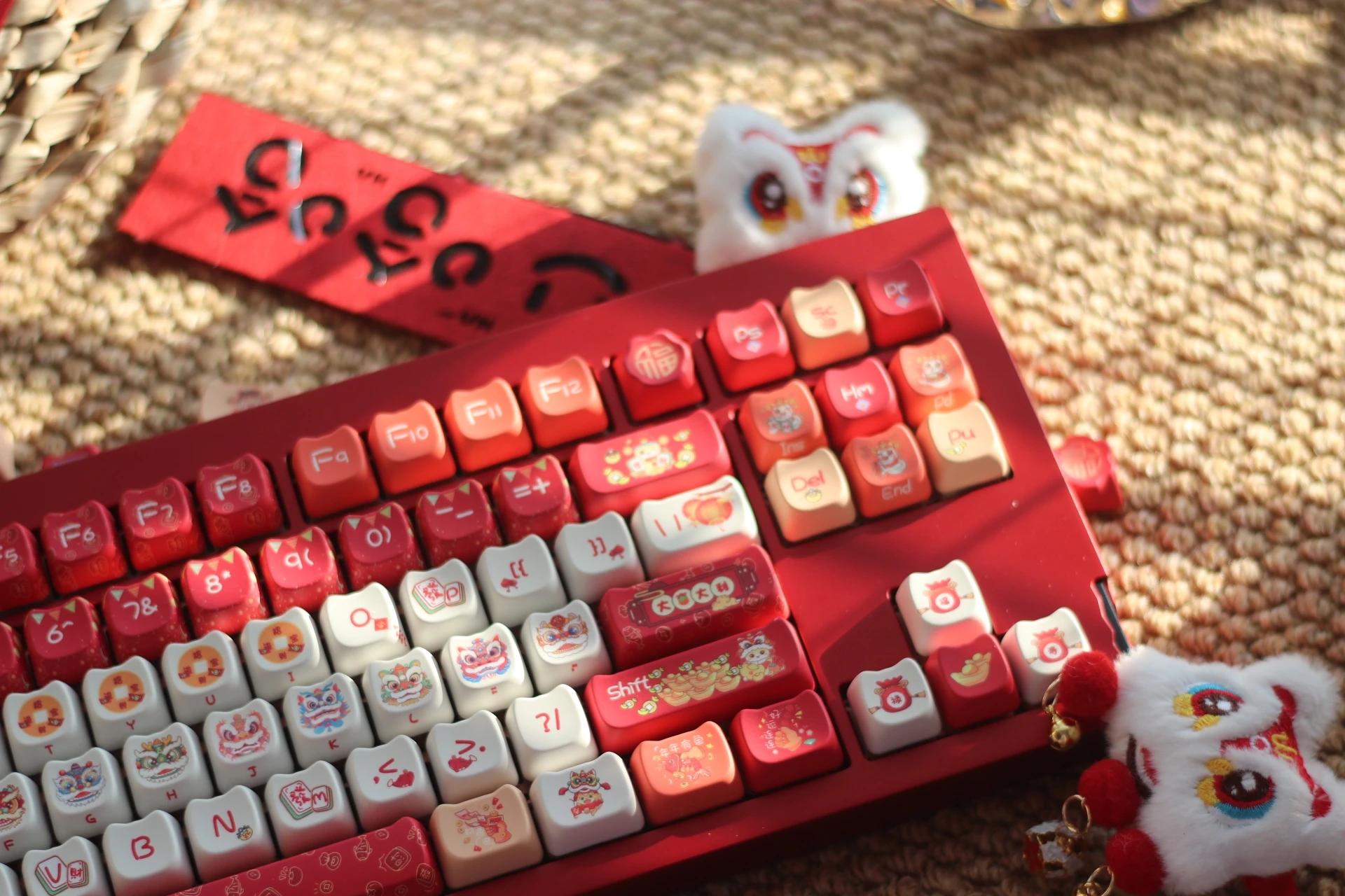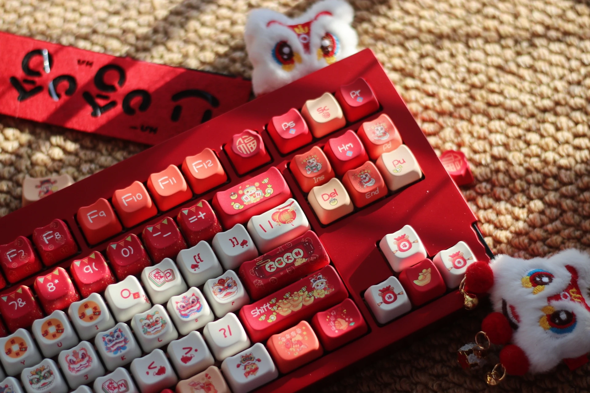 Juego de teclas con tema rojo de Año Nuevo, perfil MAO, lindas teclas con orejas de gato, sublimación térmica PBT, danza del león, teclas de teclado mecánico