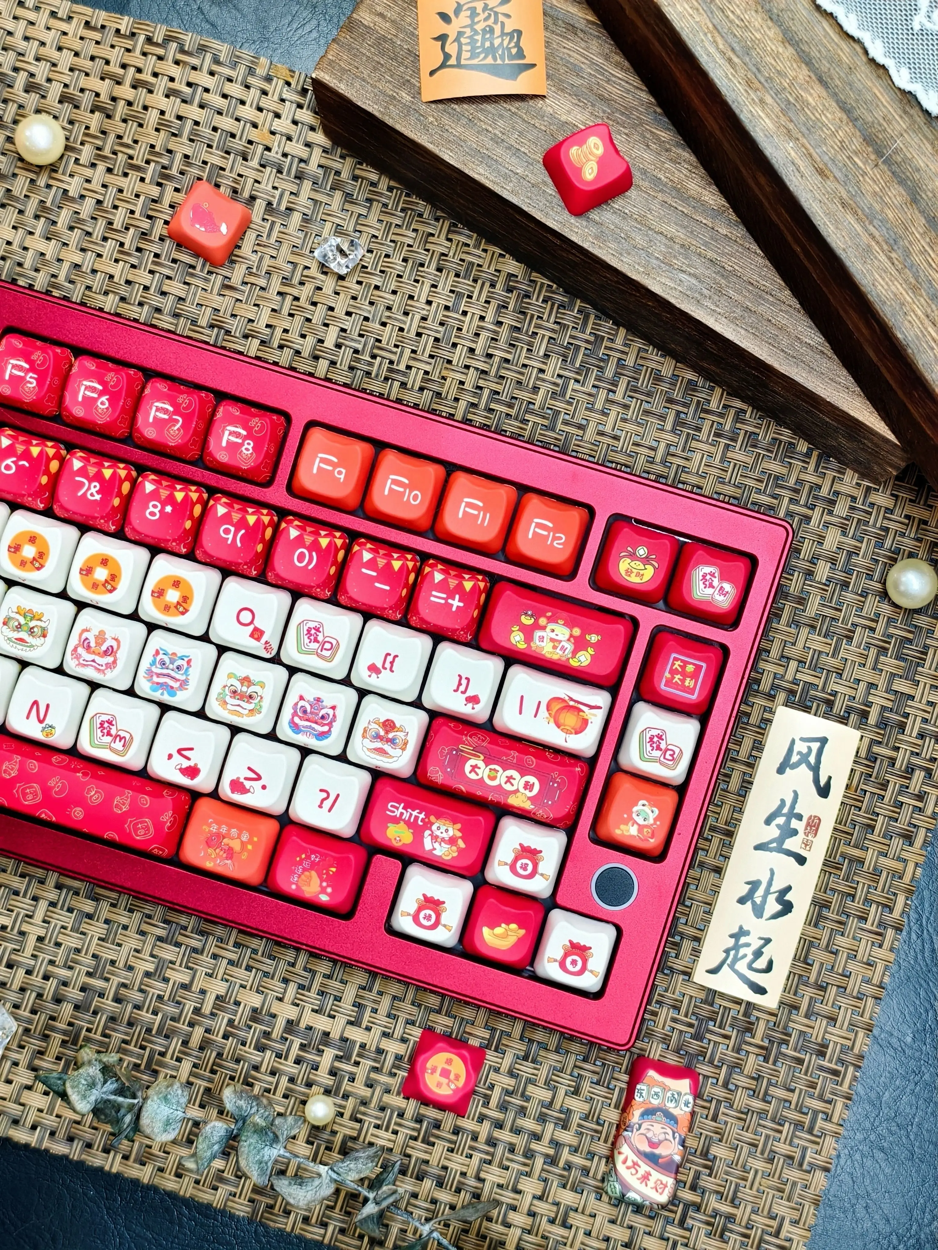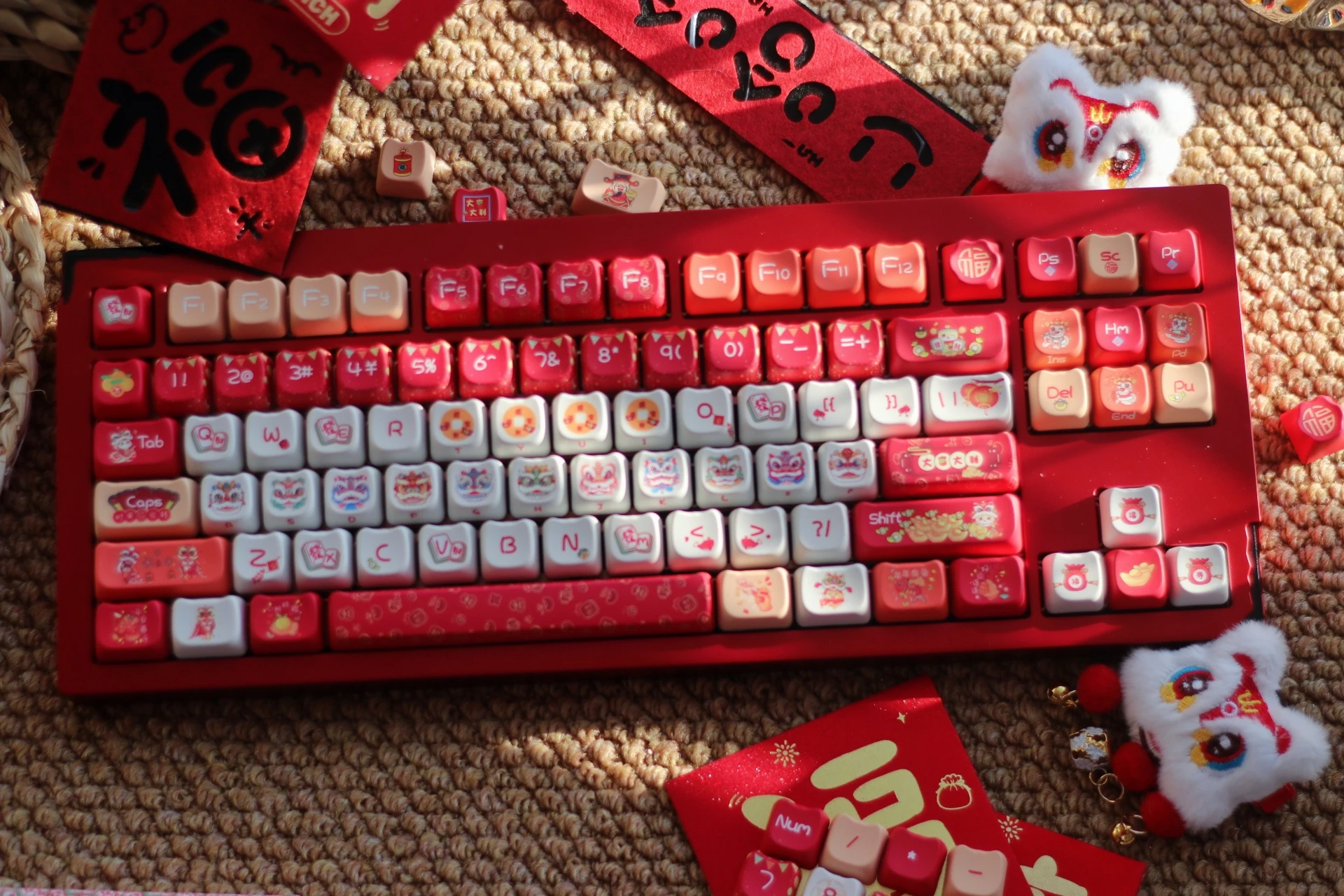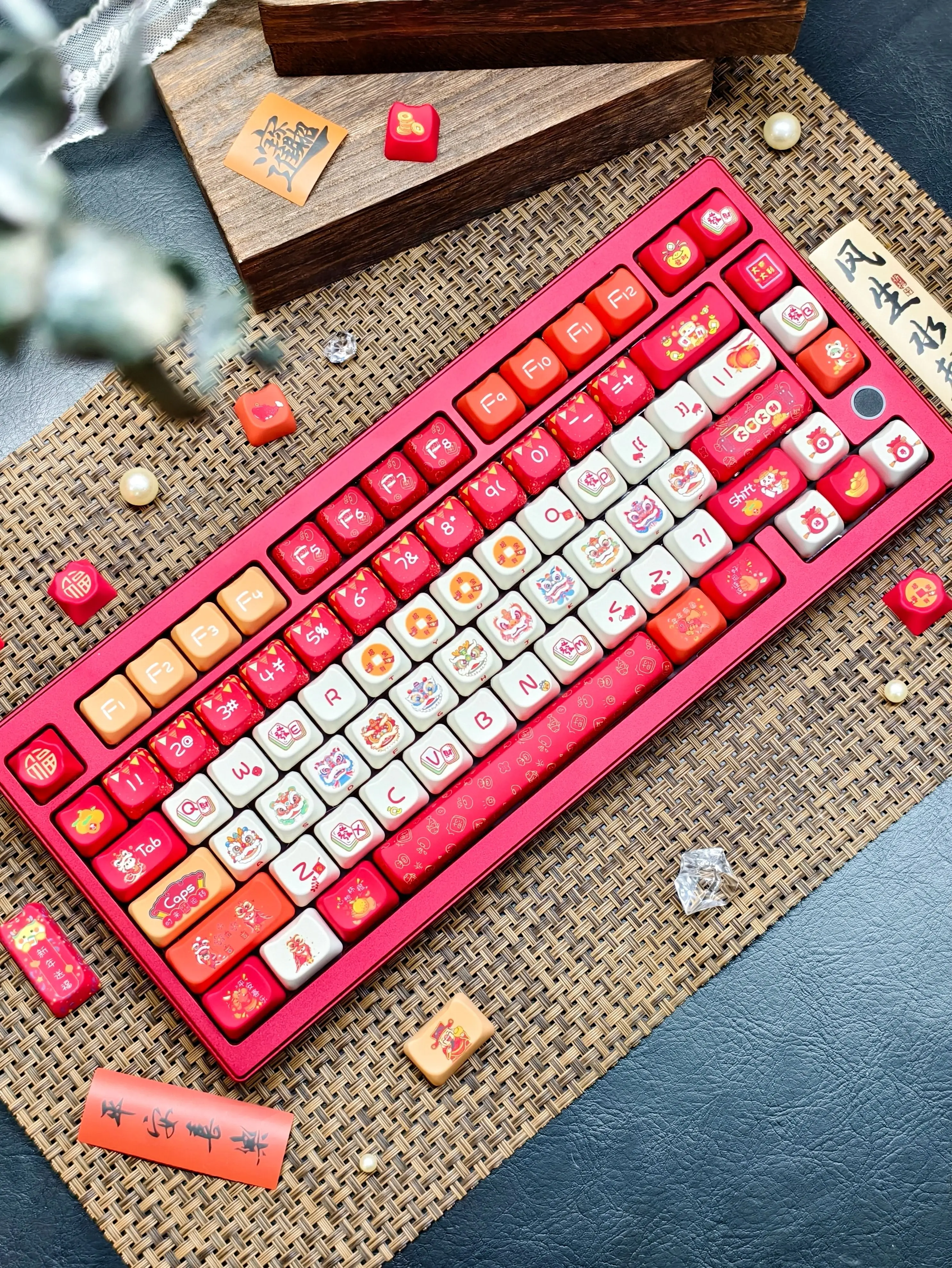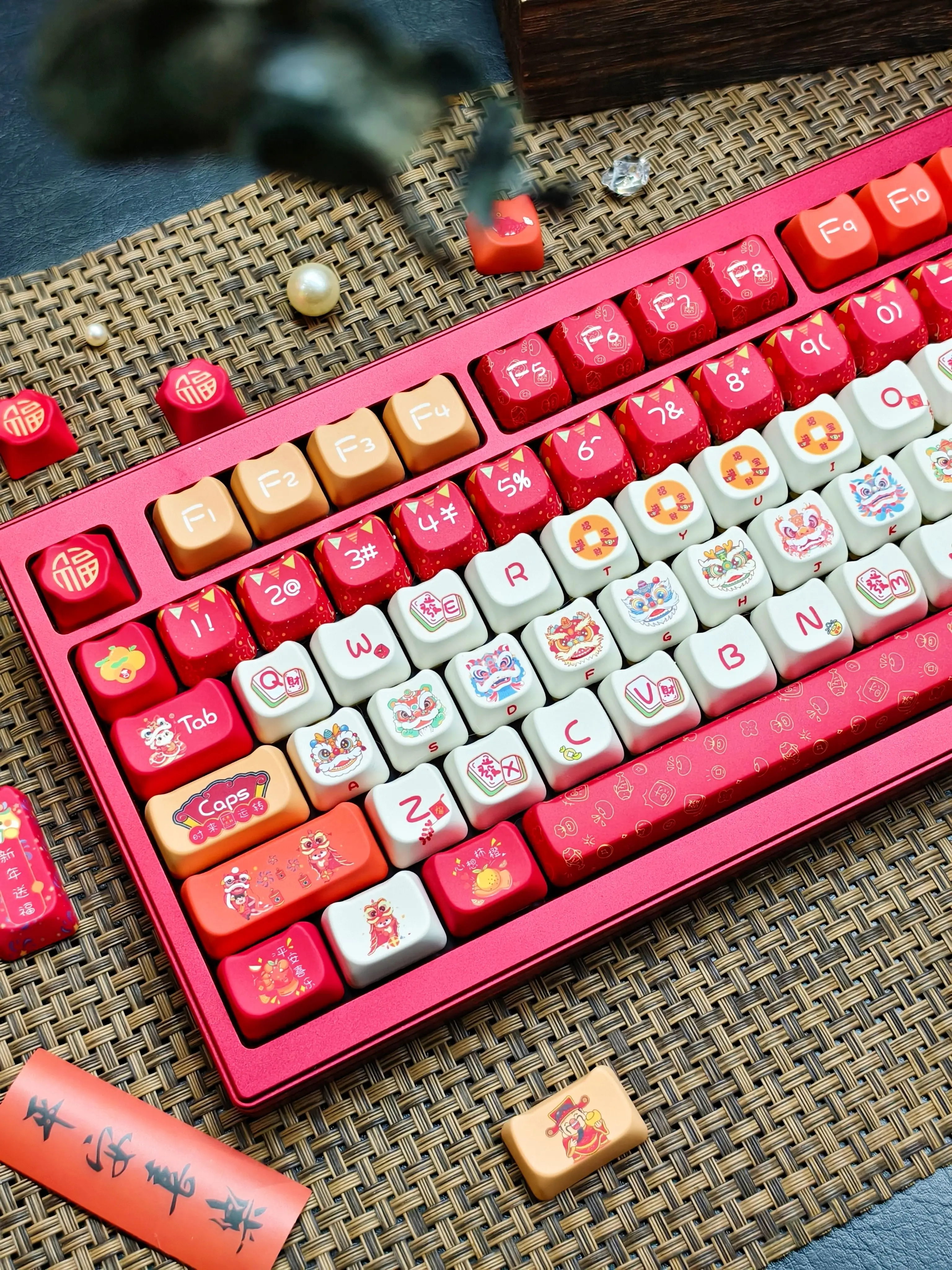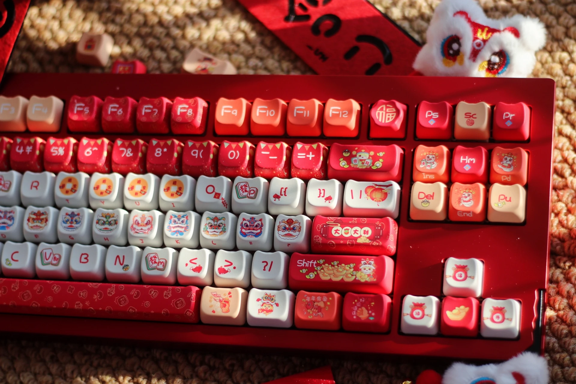 Juego de teclas con tema rojo de Año Nuevo, perfil MAO, lindas teclas con orejas de gato, sublimación térmica PBT, danza del león, teclas de teclado mecánico