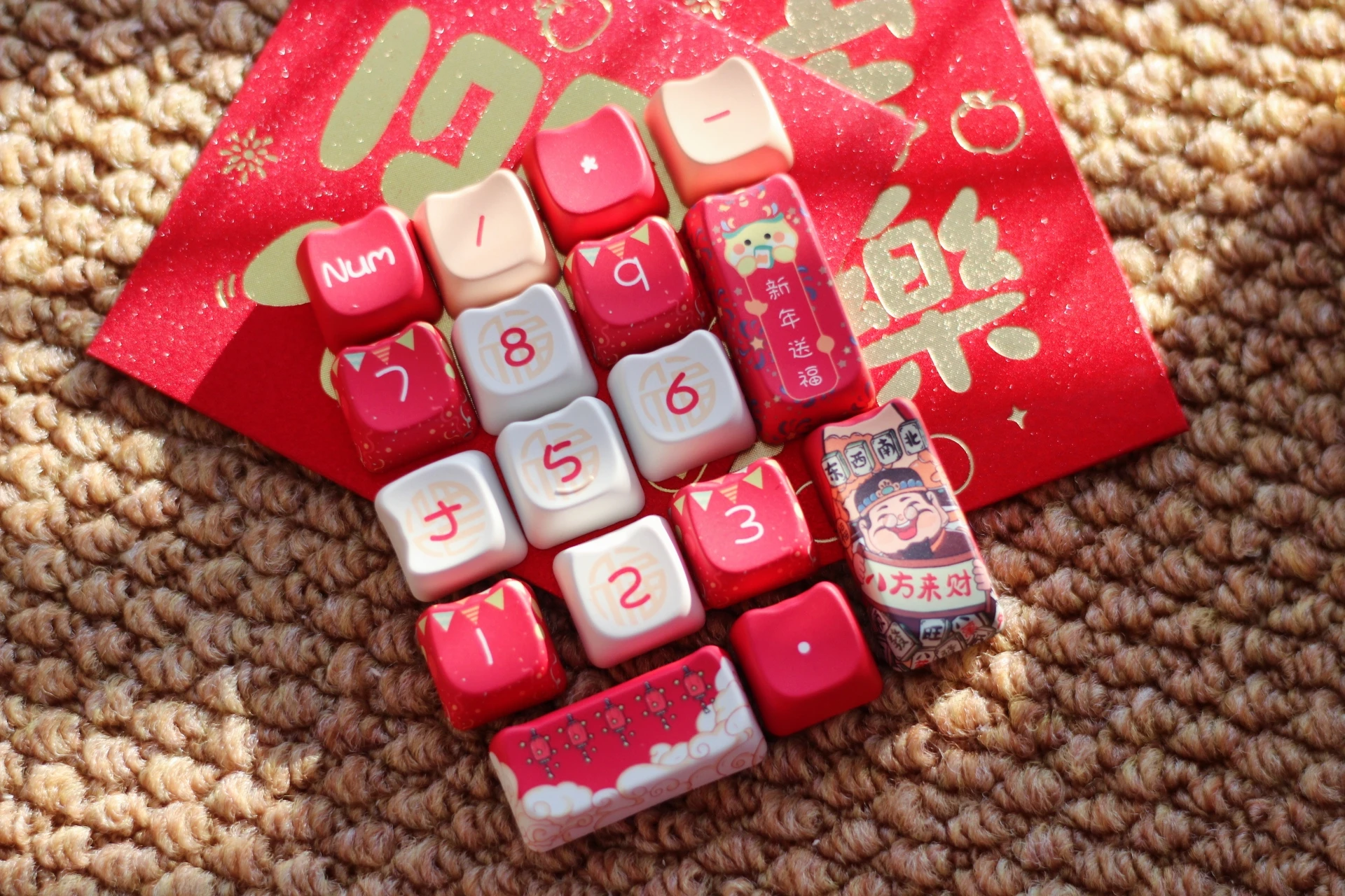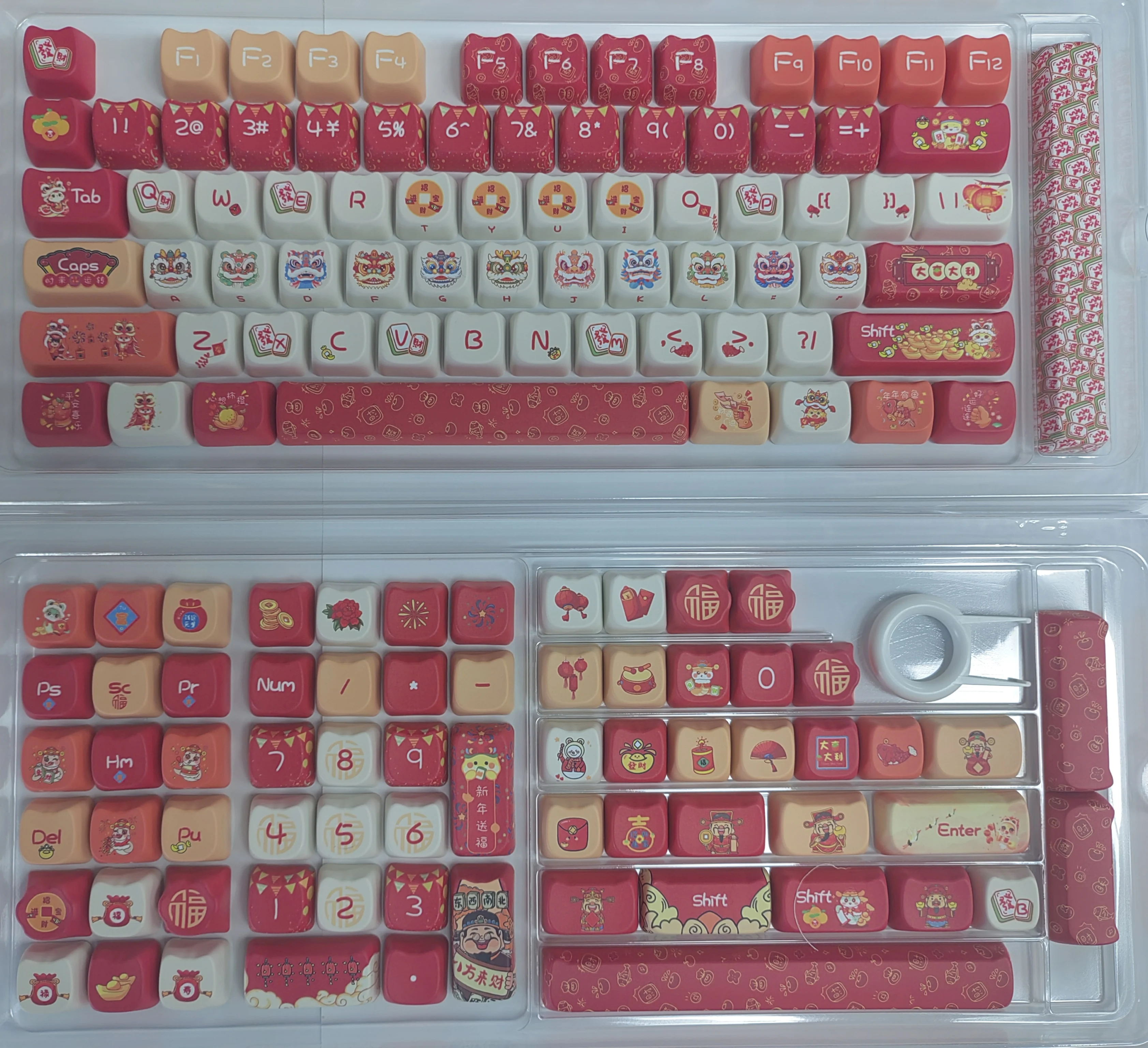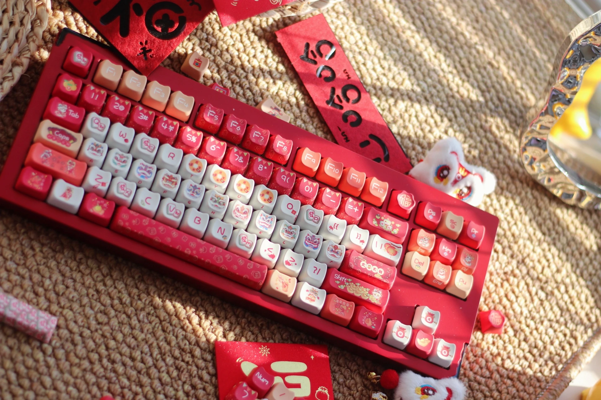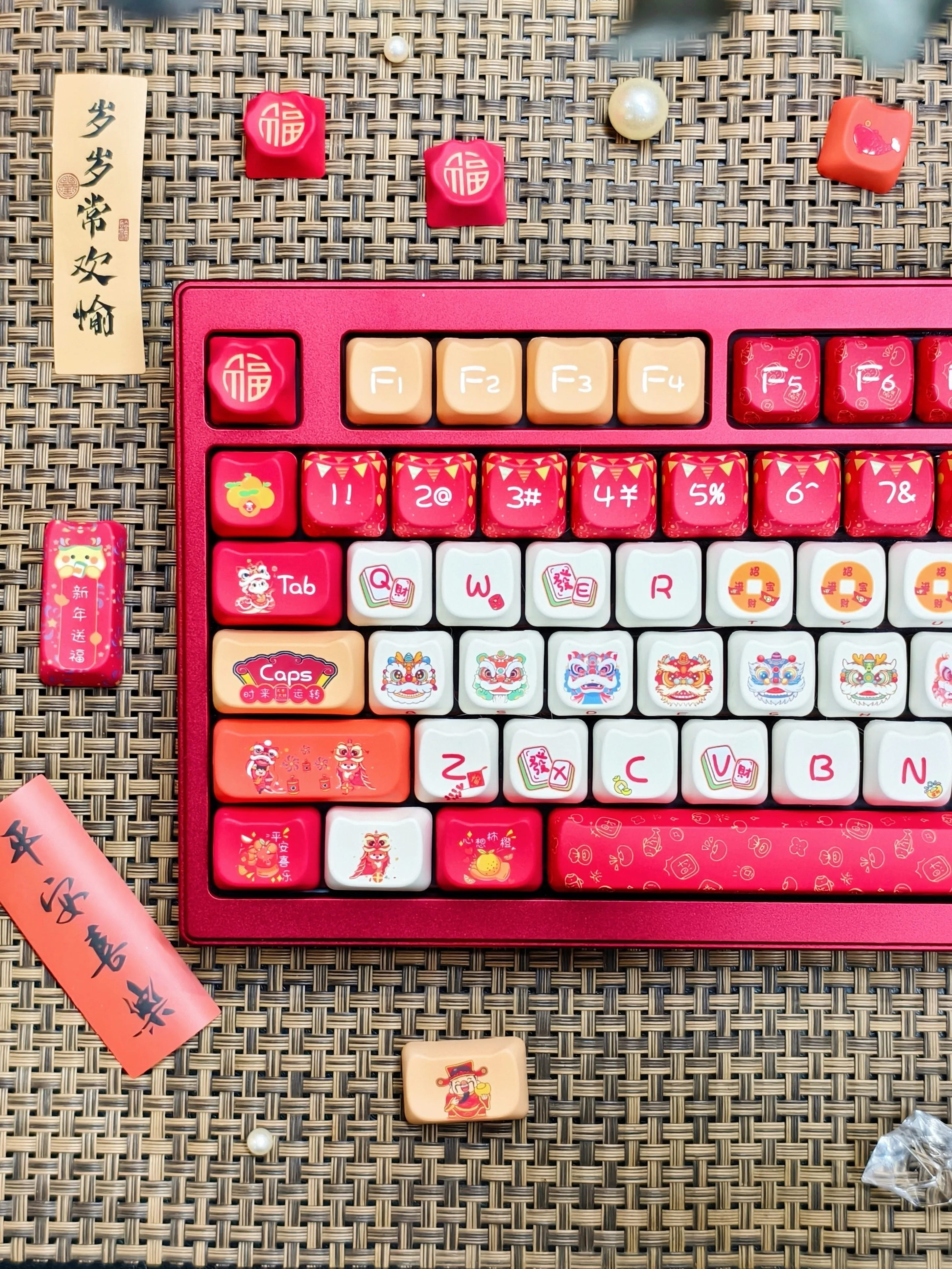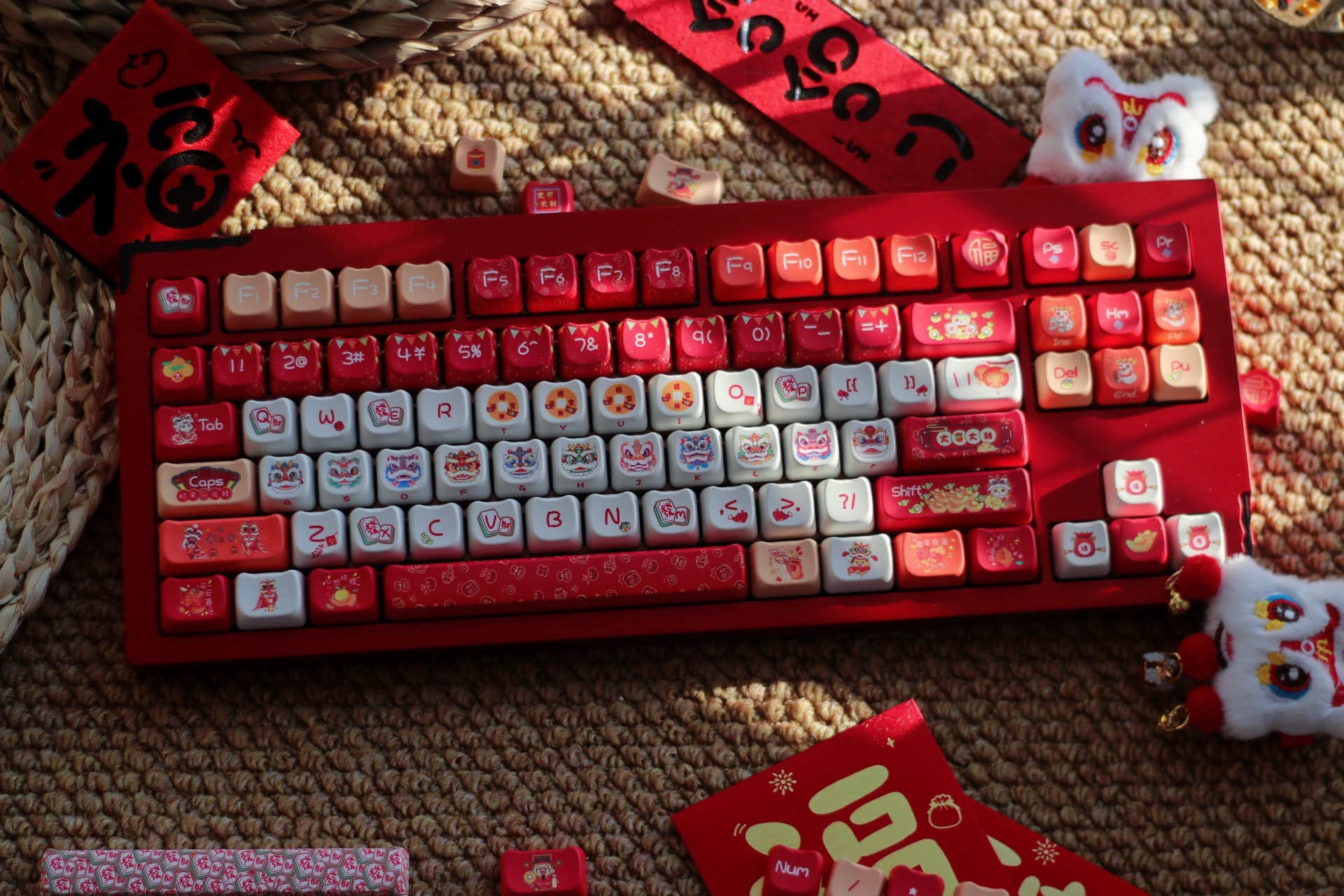 Juego de teclas con tema rojo de Año Nuevo, perfil MAO, lindas teclas con orejas de gato, sublimación térmica PBT, danza del león, teclas de teclado mecánico