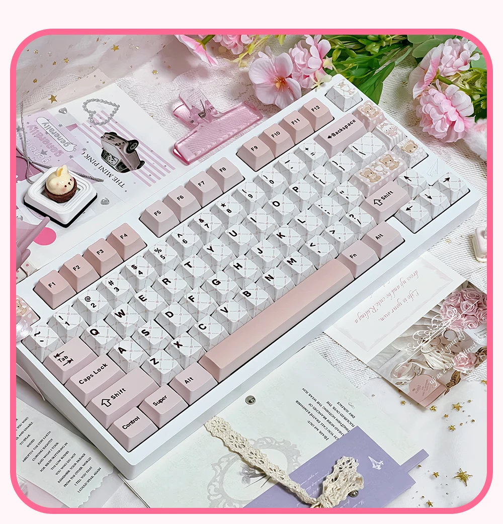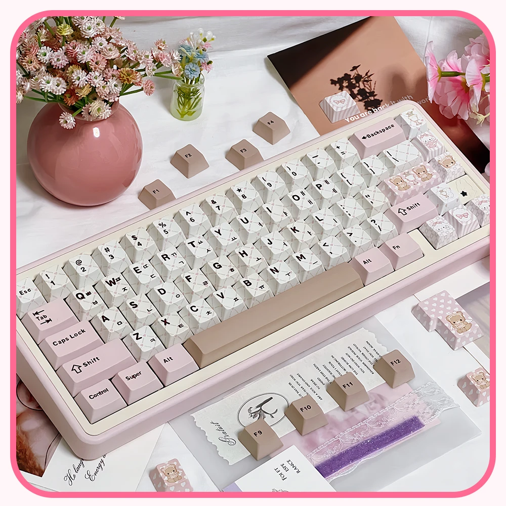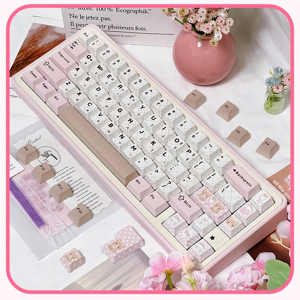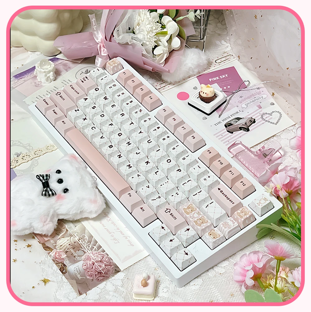 Juego de teclas temáticas rosadas para fiesta de té de osito, perfil de cereza PBT, teclas originales hechas a mano personalizadas para teclado mecánico, regalo
