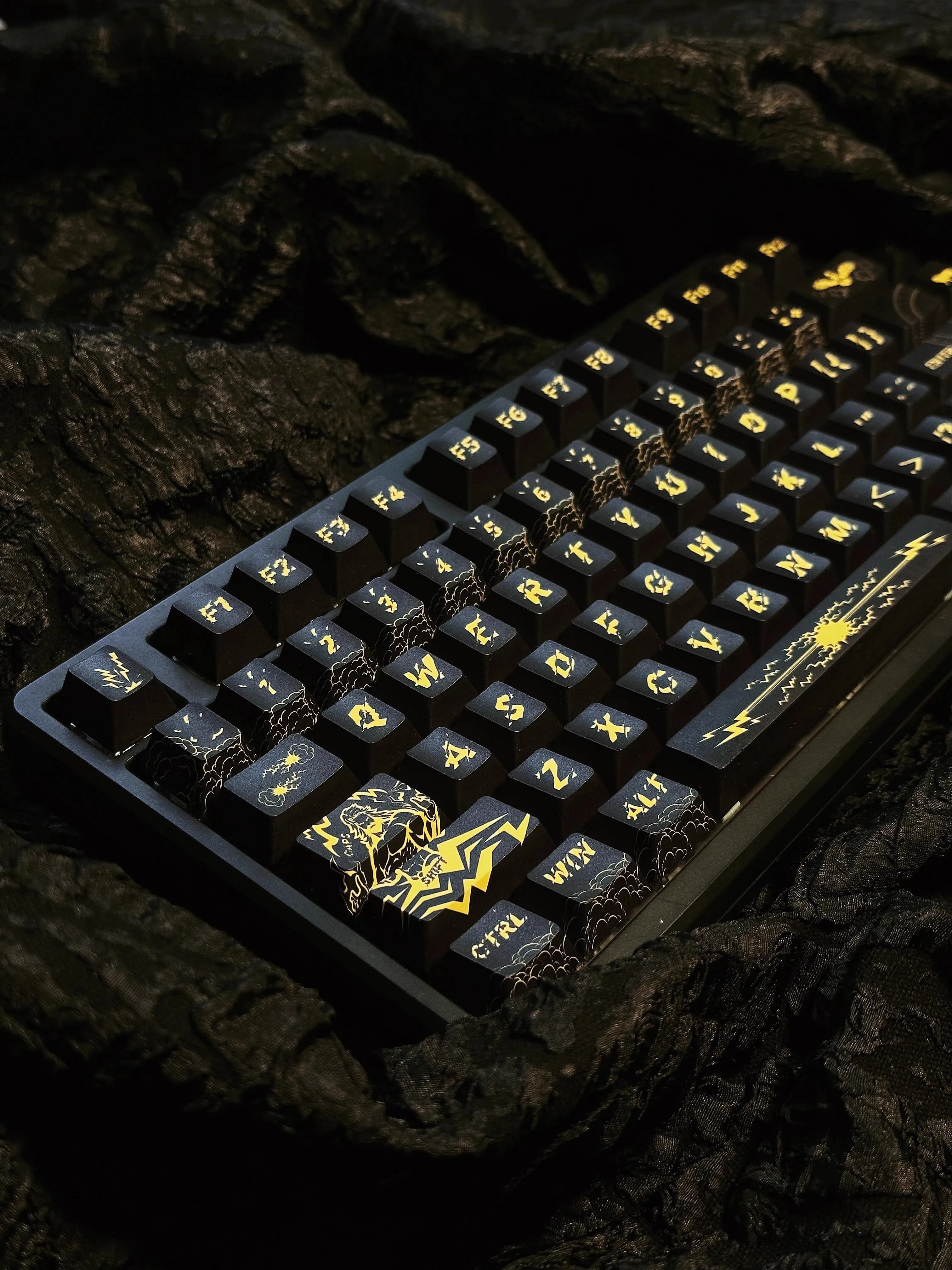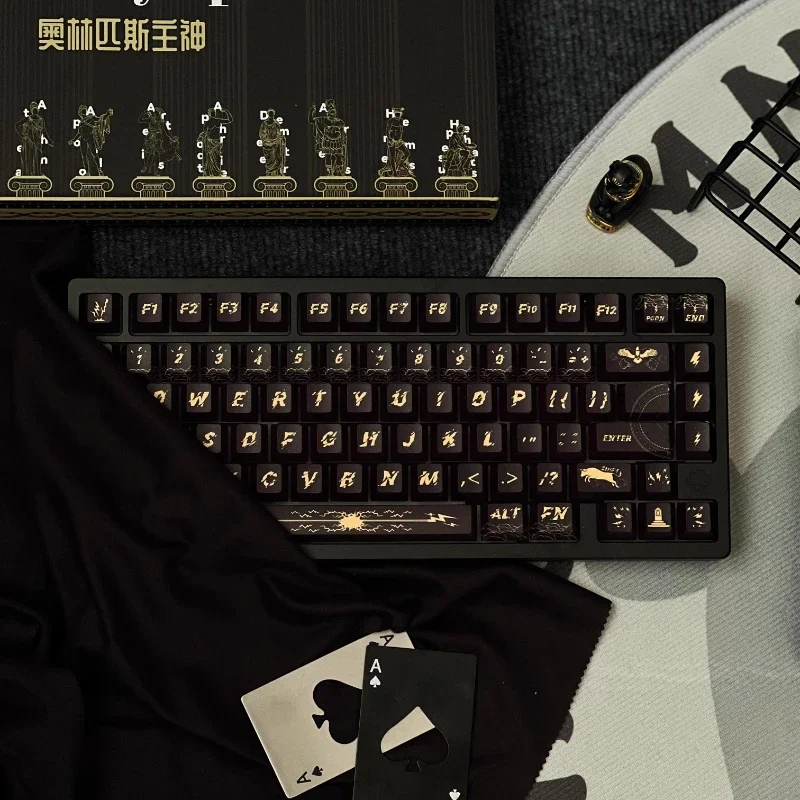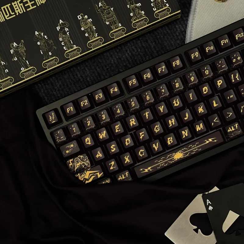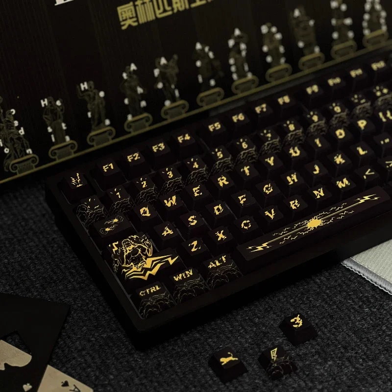 Juego de teclas temáticas Zeus, tapas de teclas de perfil de cereza de sublimación PBT para accesorios de teclado mecánico, 142 teclas, juego de teclas de oro negro
