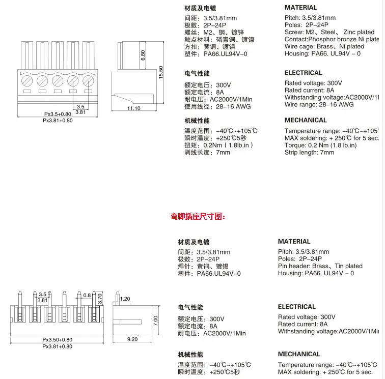 10 sets 3,81mm 2/3/4/5/6/7/8 pin Tipo de enchufe de Terminal de ángulo recto 3,81 pitch conector pcb bloque de terminales de tornillo