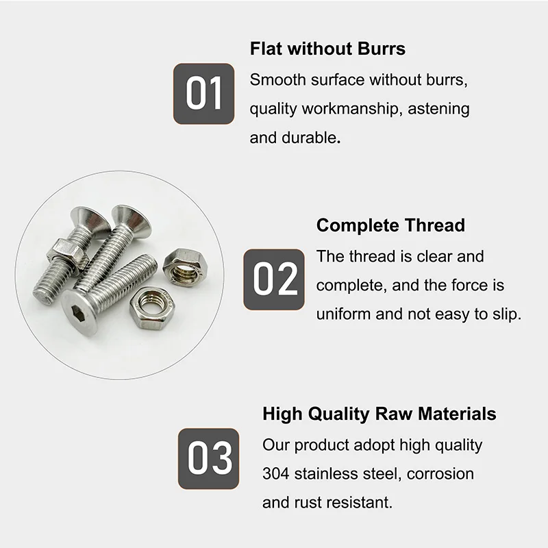 1.El acero inoxidable 304 de alta calidad proporciona resistencia y ofrece buena resistencia a la corrosión en muchos entornos; Diferentes tamaños: M3/4/5/6