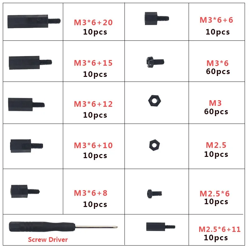 Este es el kit de tornillos y tuercas para Raspberry Pi, incluidos los modelos M2.5 y M3, ambos hechos de nailon negro.