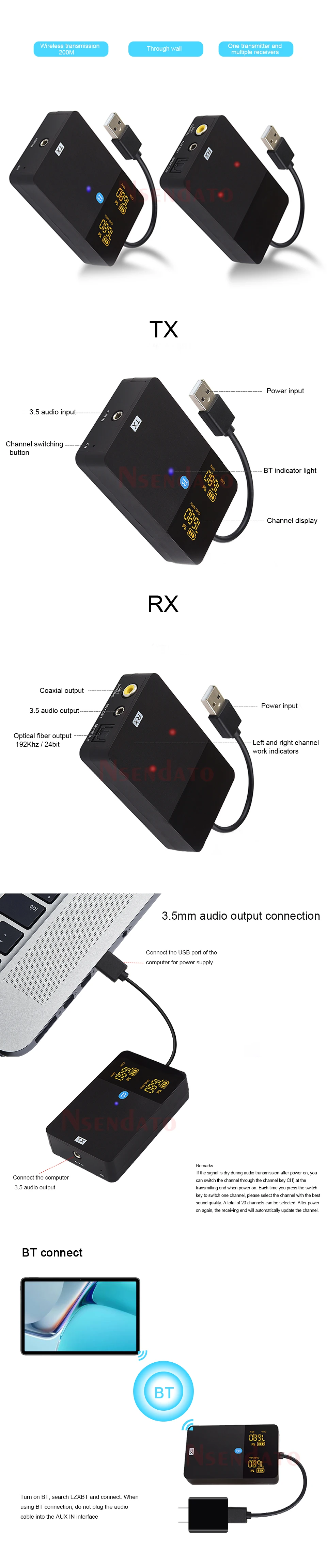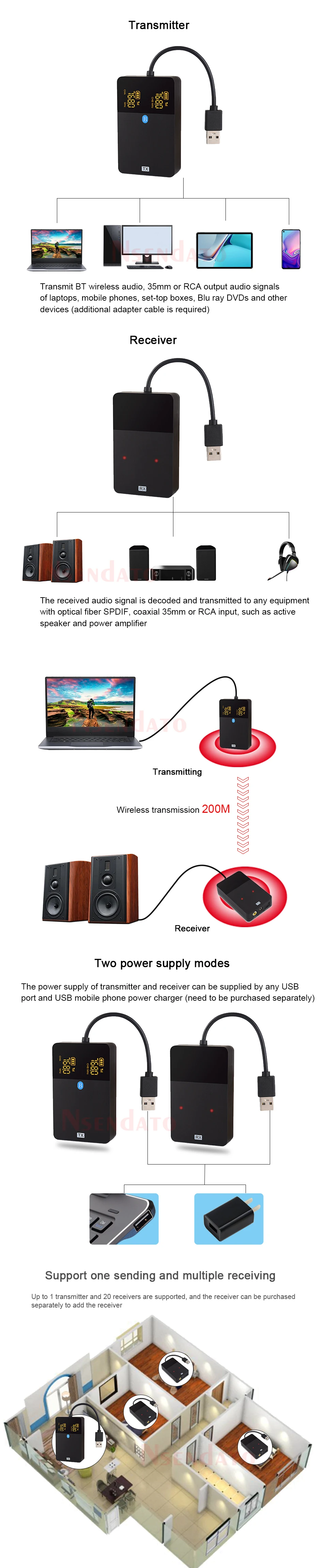 Juego de receptor y transmisor de Audio inalámbrico de 200m, adaptador de audio inalámbrico Plug Play de alta fidelidad sin obstáculos para auriculares y altavoces de TV
