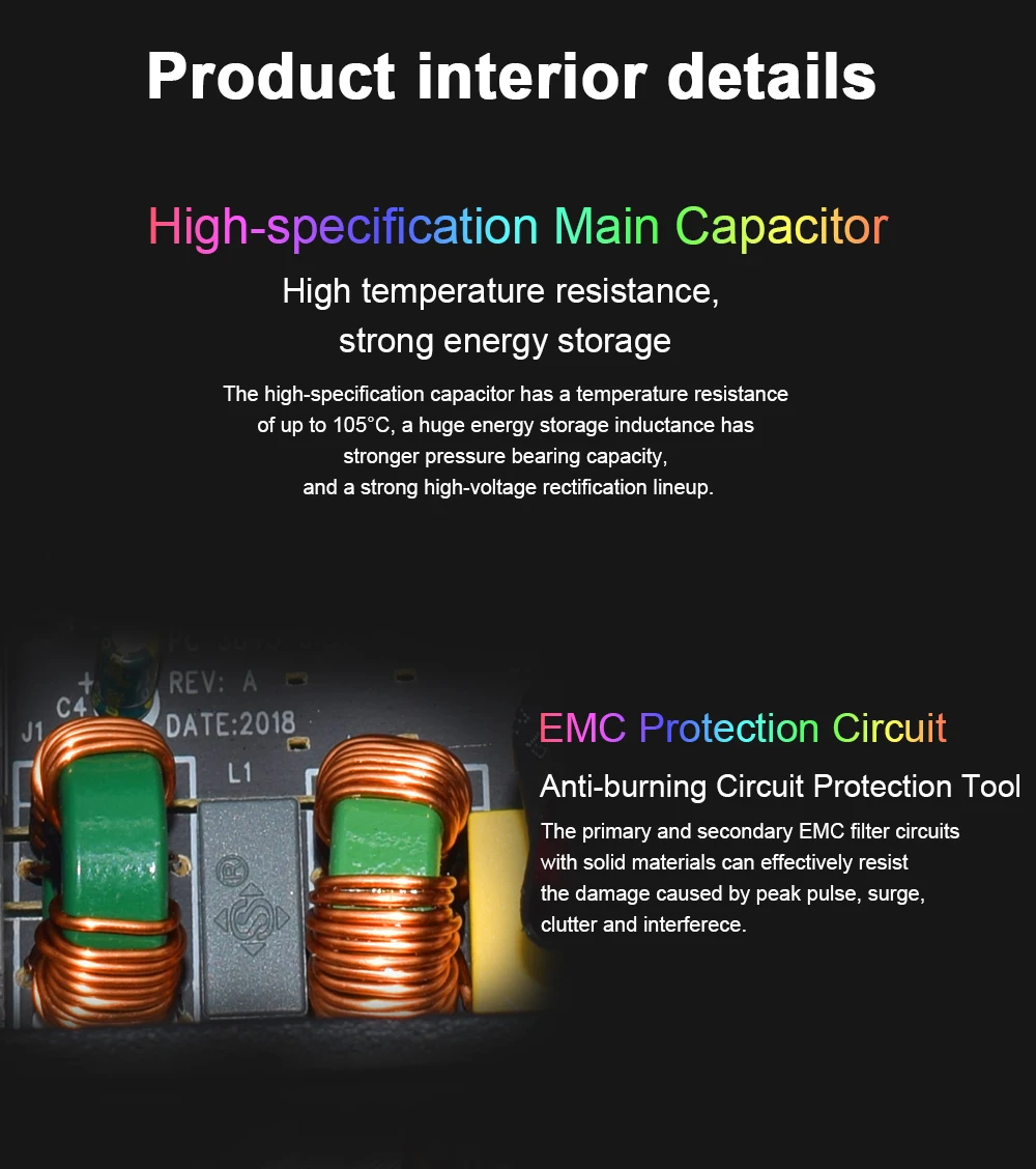 4.La fuente de alimentación de salida de 12 V está presurizada, lo que cumple completamente con la fuente de alimentación de la CPU y la tarjeta gráfica, con gran potencia y salida duradera.