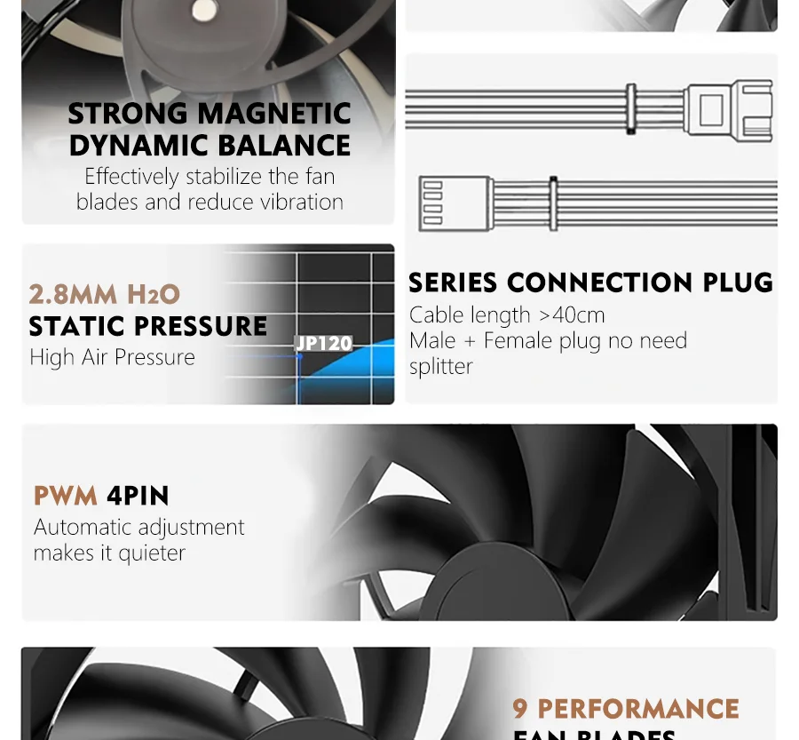 Ventiladores de muy buena calidad y alto rendimiento. Funcionan silenciosamente y tienen una función de conexión en cadena. Muy buena relación calidad-precio, sin duda los volvería a comprar.